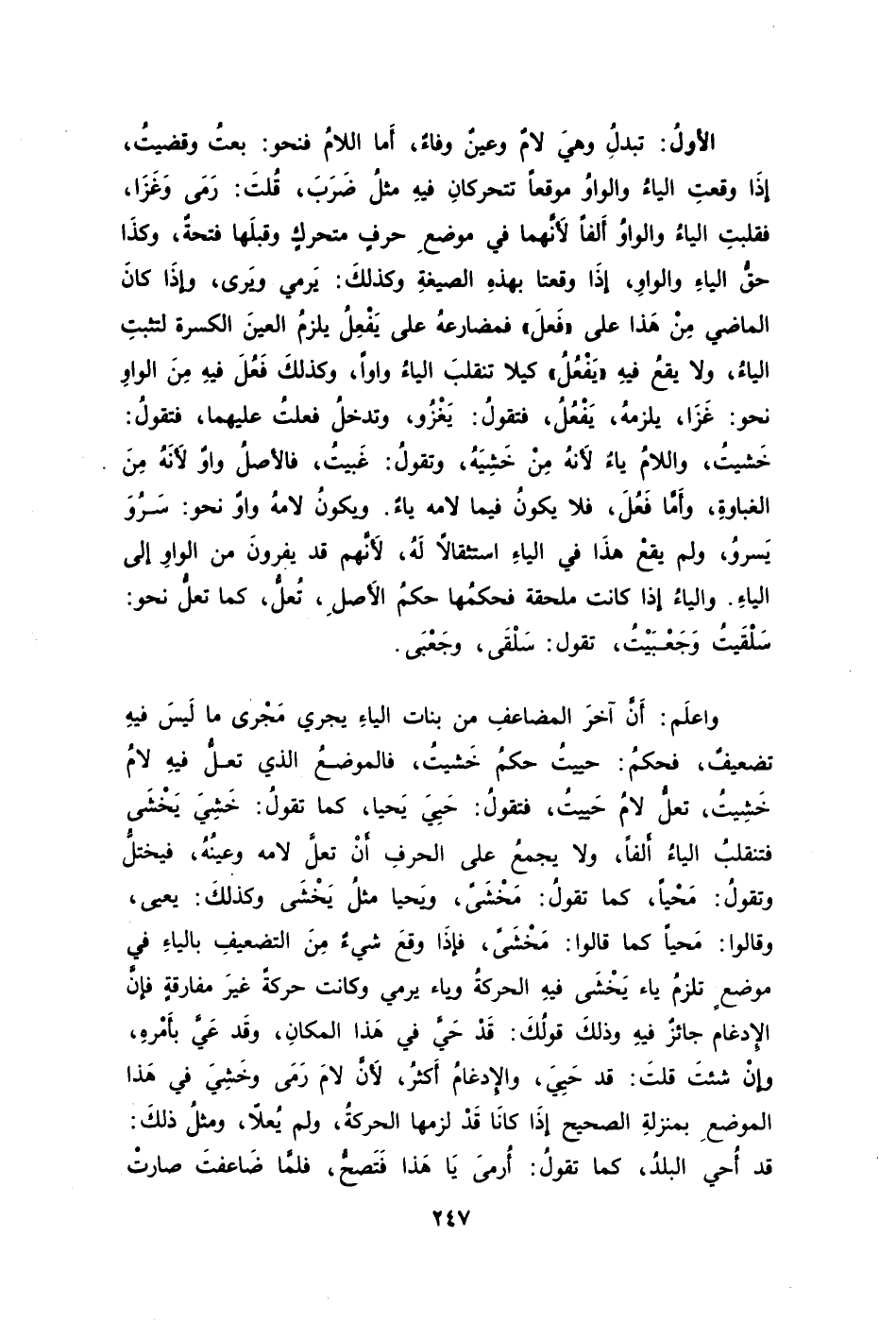 الأولُ: تبدلُ وهيَ لامٌ وعينٌ وفاءٌ أَما اللامُ فنحو: بعتُ وقضيتُ إذَا وقعتِ الياءُ والواوُ موقعًا تتحركانِ فيهِ مثلُ ضَرَبَ قُلتَ: رَمَى وَغَزَا فقلبتِ الياءُ والواوُ أَلفًا لأَنَّهما في موضعِ حرفٍ متحركٍ وقبلَها فتحةٌ وكذَا حقُّ الياءِ والواوِ إذَا وقعتا بهذهِ الصيغةِ وكذلكَ: يَرمي ويَرى وإذَا كانَ الماضي مِنْ هَذا على "فَعلَ" فمضارعهُ على يَفْعِلُ يلزمُ العينَ الكسرة لتثبتِ الياءُ ولا يقعُ فيهِ "يَفْعُلُ" كيلا تنقلبَ الياءُ واوًا وكذلكَ فَعُلَ فيهِ مِنَ الواوِ نحو: غَزَا يلزمهُ يَفْعُلُ فتقولُ: يَغْزُو وتدخلُ فعلتُ عليهما فتقولُ: خَشيتُ واللامُ ياءٌ لأَنهُ مِنْ خَشِيَهُ وتقولُ: غَبيتُ فالأصلُ واوٌ لأَنَهُ مِنَ الغباوةِ وأَمَّا فَعُلَ فلا يكونُ فيما لامه ياءٌ. ويكونُ لامهُ واوٌ نحو: سَرُوَ يَسروُ ولم يقعْ هذَا في الياءِ استثقالًا لَهُ لأَنَّهم قد يفرونَ من الواوِ إلى الياءِ. والياءُ إذا كانت ملحقة فحكمُها حكمُ الأَصلِ تُعلُّ كما تعلُّ نحو: سَلْقَيتُ وَجَعْبَيْتُ تقول: سَلْقَى وجَعْبَى.
