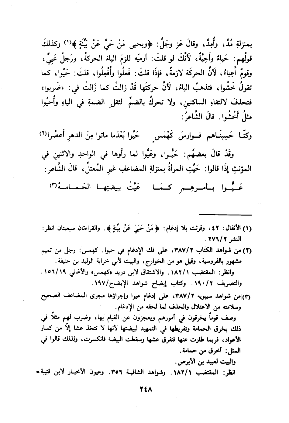 بمنزلةِ مُدَّ وأُمِدَّ وقالَ عَز وجَلَّ: {وَيَحْيَى مَنْ حَيَّ عَنْ بَيِّنَةٍ} 1 وكذلكَ قولُهم: حَياءٌ وأَحِيَّةٌ لأَنَّكَ لو قلتَ: أرميّه للزمَ الياءَ الحركةُ ورَجلٌ عَيِيٌّ وقومٌ أَعِياءُ لأَنَّ الحركَة لازمةٌ فإذَا قلتَ: فَعلُوا وأُفْعِلُوا قلتَ: حَيُوا كما تقولُ خَشُوا فتذهبُ الياءُ لأَنَّ حركتَها قَدْ زالتْ كما زَالتْ في: "ضَربوا" فتحذفَ لإلتقاءِ الساكنينِ ولا تحركُ بالضمِّ لثقلِ الضمةِ في الياءِ وأُحيُوا مثلُ أَخْشُوا. قالَ الشاَّعرُ: