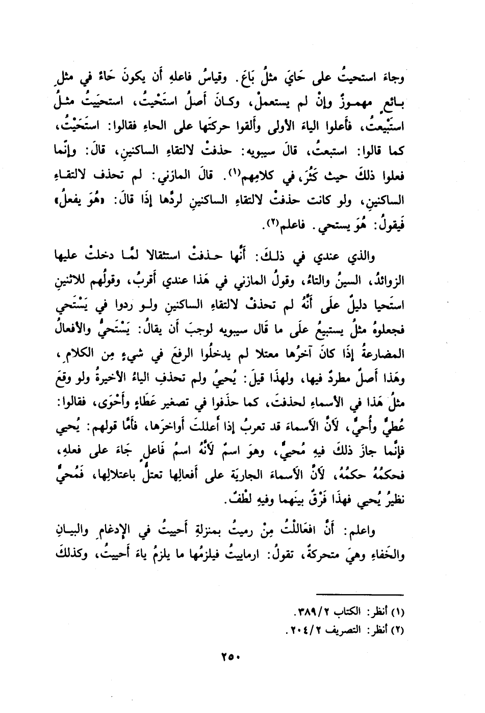 والذي عندي في ذلكَ: أَنَّها حذفتْ استثقالا لمَّا دخلتْ عليها الزوائدُ السينُ والتاءُ وقولُ المازني في هَذا عندي أَقربُ وقولُهم للإثنينِ استَحيا دليلٌ علَى أَنَّهُ لم تحذفْ لإلتقاءِ الساكنينِ ولو ردوا في يَسْتَحي فجعلوهُ مثلُ يستبيعُ علَى ما قاَل سيبويه لوجب أَن يقالُ: يَسْتَحيُّ والأفعالُ المضارعةُ إذَا كانَ آخرُها معتلا لم يدخلُوا الرفعَ في شيءٍ مِن الكلامِ وهَذا أَصلٌ مطردٌ فيها ولهذَا قيلَ: يُحيُ ولم تحذفِ الياءُ الأخيرةُ ولو وقعَ مثلُ هَذا في الأسماءِ لحذفتِ كما حذَفوا في تصغيرَ عَطَاءٍ وأَحْوَى فقالوا: عُطيٌّ وأُحيٌّ لأَنَّ الأَسماءَ قد تعربُ إذا أَعللتَ أَواخرَها فأَمَّا قولهم: يُحيى فإنَّما جازَ ذلكَ فيهِ مُحييٌّ وهوَ اسمٌ لأَنَّهُ اسمُ فَاعلٍ جَاءَ على فعلِه فحكمُهُ حكمُهُ لأَنَّ الأَسماءَ الجاريَة على أَفعالِها تعتلُّ باعتلالِها فَمُحيٌّ نظيرُ يُحيي فهذَا فَرْقٌ بينَهما وفيهِ لطْفٌ.