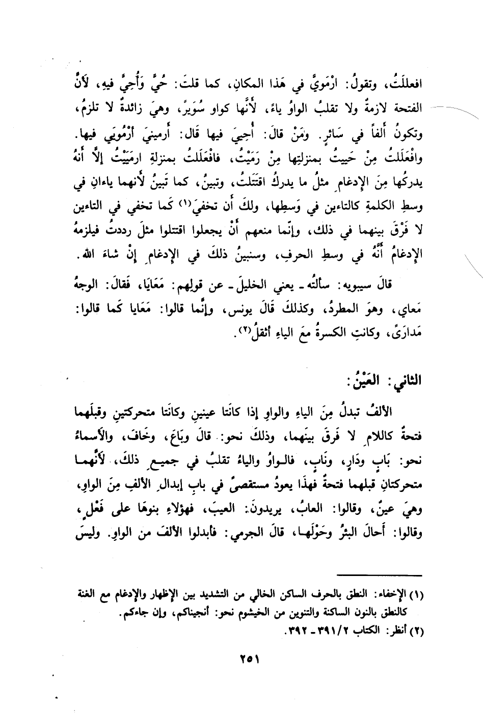 الألفُ تبدلُ مِنَ الياءِ والواوِ إذا كانَتا عينينِ وكانَتا متحركتينِ وقبلَهما فتحةٌ كاللامِ لا فَرقَ بينَهما وذلكَ نحو: قالَ وبَاعَ وخَافَ والأَسماءُ نحو: بَابٍ ودَارٍ ونَابٍ فالواوُ والياءُ تقلبُ في جميع ذلكَ لأَنَّهما متحركتانِ قبلهما فتحةٌ فهذاَ يعودُ مستقصىً في بابِ إبدالِ الألفِ مِنَ الواوِ وهيَ عينٌ وقالوا: العابُ يريدونَ: العيبَ فهؤلاءِ بنوهَا على فَعْلٍ وقالوا: أَحالَ البئرُ وحَوْلَها قالَ الجرمي: فأبدلوا الألفَ من الواوِ. وليسَ