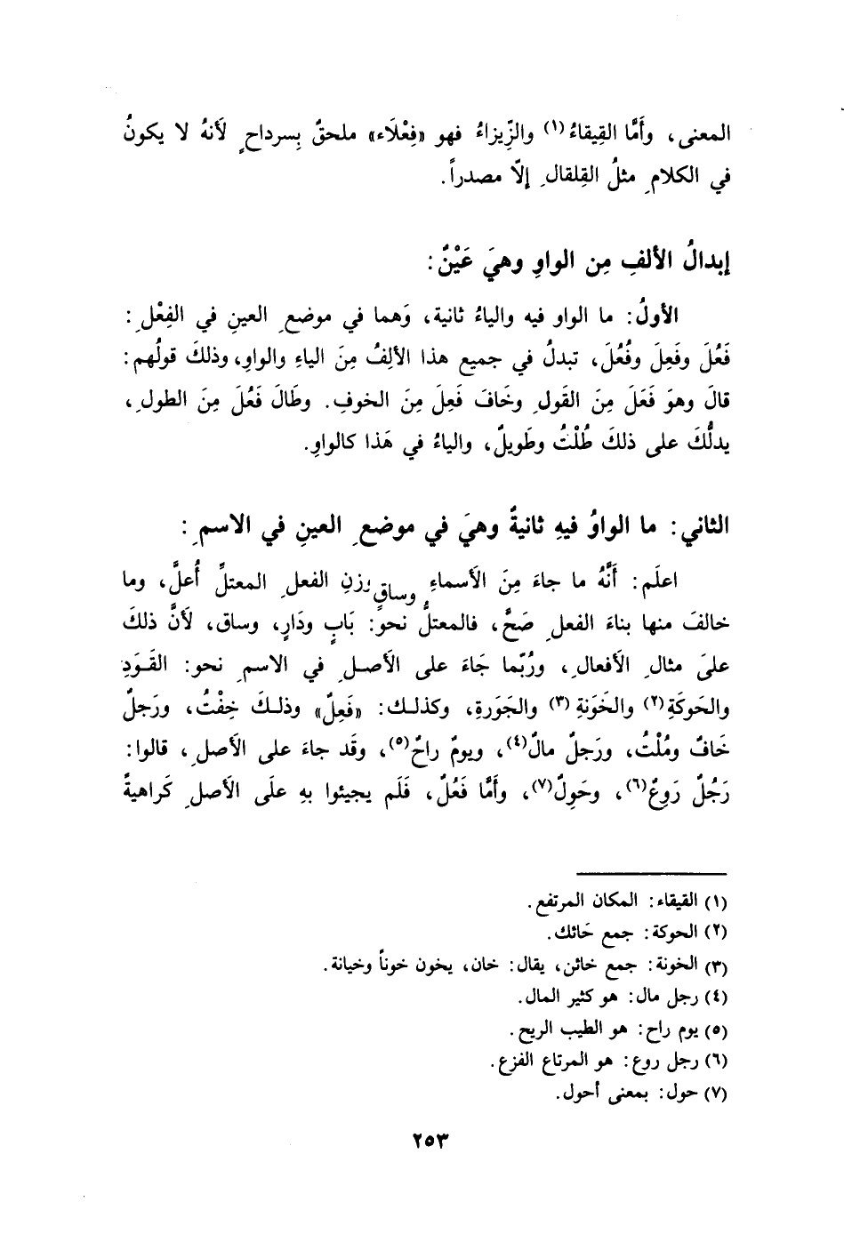 الأولُ: ما الواو فيه والياءُ ثانية وَهما في موضعِ العينِ في الفِعْلِ: فَعُلَ وفَعِلَ وفُعُلَ تبدلُ في جميع هذا الألِفُ مِنَ الياءِ والواوِ وذلكَ قولُهم: قالَ وهوَ فَعَلَ مِنَ القَولِ وخَافَ فَعِلَ مِنَ الخوفِ. وطَالَ فَعُلَ مِنَ الطولِ يدلُّكَ على ذلكَ طُلْتُ وطَويلٌ والياءُ في هَذا كالواوِ.
