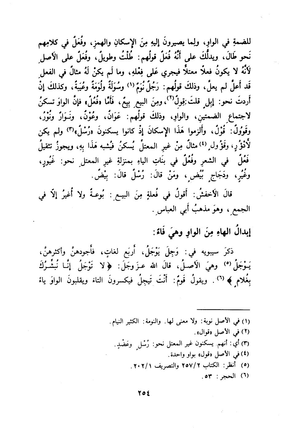 للضمةِ في الواوِ ولِما يصيرونَ إليهِ مِنَ الإِسكانِ والهمزِ وفُعَلٌ في كلامِهم نَحو طَالَ ويدلَّكَ على أَنَّهُ فُعَلٌ قولُهم: طُلْتُ وطويلٌ وفُعَلٌ على الأَصلِ لأَنَّهُ لا يكونُ فعلًا معتلًا فيجري عَلى فِعْلهِ وما لَم يكنْ لَهُ مثالٌ في الفعلِ قَد أَعلَّ لم يعلَّ وذلكَ قولُهم: رَجُلٌ نُوَمٌ1 وسُوَلَةٌ وَلُوَمَةٌ وعُيَبةٌ وكذلكَ إنْ أَردتَ نحو: إبِلٍ قلتَ: قِوِلٌ2، ومِنَ البيعِ بِيعٌ فَأَمَّا "فُعُلٌ" فإنَّ الواوَ تسكنُ لإجتماعِ الضمتينِ والواوِ وذلكَ قولُهم: عَوَانٌ وعُونٌ ونَوَارٌ ونُورٌ وقَووُلٌ: قُولٌ وأَلزموا هَذَا الإِسكانَ إذْ كانوا يسكنونَ "رُسْلٌ"3 ولم يكن لأَدْؤُرٍ وقَؤُولٍ4 مثالٌ مِنْ غيرِ المعتلِّ يُسكنُ فيُشبه هَذَا بِهِ ويجوزُ تثقيلُ فَعُلٌ في الشعرِ وفُعُلٌ في بنَاتِ الياءِ بمنزلةِ غيرِ المعتلِ نحو: غَيُورٍ وغُيُرٍ ودَجَاجٍ بُيُضٍ ومَنْ قالَ: رُسْلٌ قالَ: بِيْضٌ.