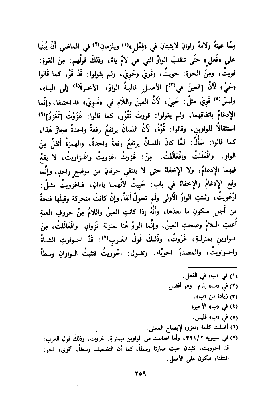 مِمّا عينهُ ولامهُ واوانِ لا يثبتانِ في "فِعْلٍ"1 ويلزمانِ2 في الماضي اَنْ يُبنَيا على "فَعِلٍ" حتَى تنقلبَ الواوُ التي هي لامٌ ياءً وذلكَ قولُهم: مِنَ القوةِ: قويتُ ومِنَ الحوةِ: حويتُ وقَويَ وحَوِيَ ولم يقولوا: قَدْ قَوَّ كما قَالوا "حَيَّ" لأَنَّ [العينَ في3] الأصلِ قالبةٌ الواوَ الآخرةَ4 إلى الياءِ وليسَ5 قَوِيَ مثلُ: حَيِيّ لأَنَّ العينَ واللام في "قَوِيَ" قد اختلفا وإنّما الإِدغامُ بإتفاقِهما ولم يقولوا: قووتَ تَقْوُو كما قالوا: غَزَوْتَ [تَغَزوُ] 6 استثقالًا للواوينِ وقالوا: قُوَّةٌ لأَنَّ اللسانَ يرتفعُ رفعةً واحدةً فجازَ هَذا كما قالوا: سَأَلٌ: لمَّا كانَ اللسانُ يرتفعُ رفعةً واحدةً والهمزةُ أَثقلُ مِنَ الواوِ. وافْعَلَلتُ وافْعَالَلتُ مِنْ غَزوتُ اغزويتُ واغَزاويتُ لا يقعُ فيهما الإِدغامُ ولا الإِخفاءُ حتَى لا يلتقي حرفانِ من موضعٍ واحدٍ وإنَّما وقعَ الإِدغامُ والإِخفاءُ في بابِ: حَيِيتُ لأَنَّهما ياءانِ فاغزويتُ مثلُ: ارْعَويتُ وثبتتِ الواوُ الأولى ولَم تحولْ أَلفًا وإنْ كانتْ متحركة وقبلَها فتحةٌ من أَجلِ سكونِ ما بعدَها وأَنَّهُ إذا كانتِ العينُ واللامُ مِنْ حروفِ العلةِ أُعلتِ اللامُ وصحتِ العينُ وإنَّما الواوُ هُنا بمنزلة نَزَوانٍ وافْعَالَلتُ مِنَ الواوينِ بمنزلةِ غَزَوتُ وذَلكَ قَولُ العَربِ7: قَدْ احواوتِ الشاةُ واحواويتُ والمصدرُ احويَّاء. وتقول: احْوويتُ فتثبتُ الواوانِ وسطاً