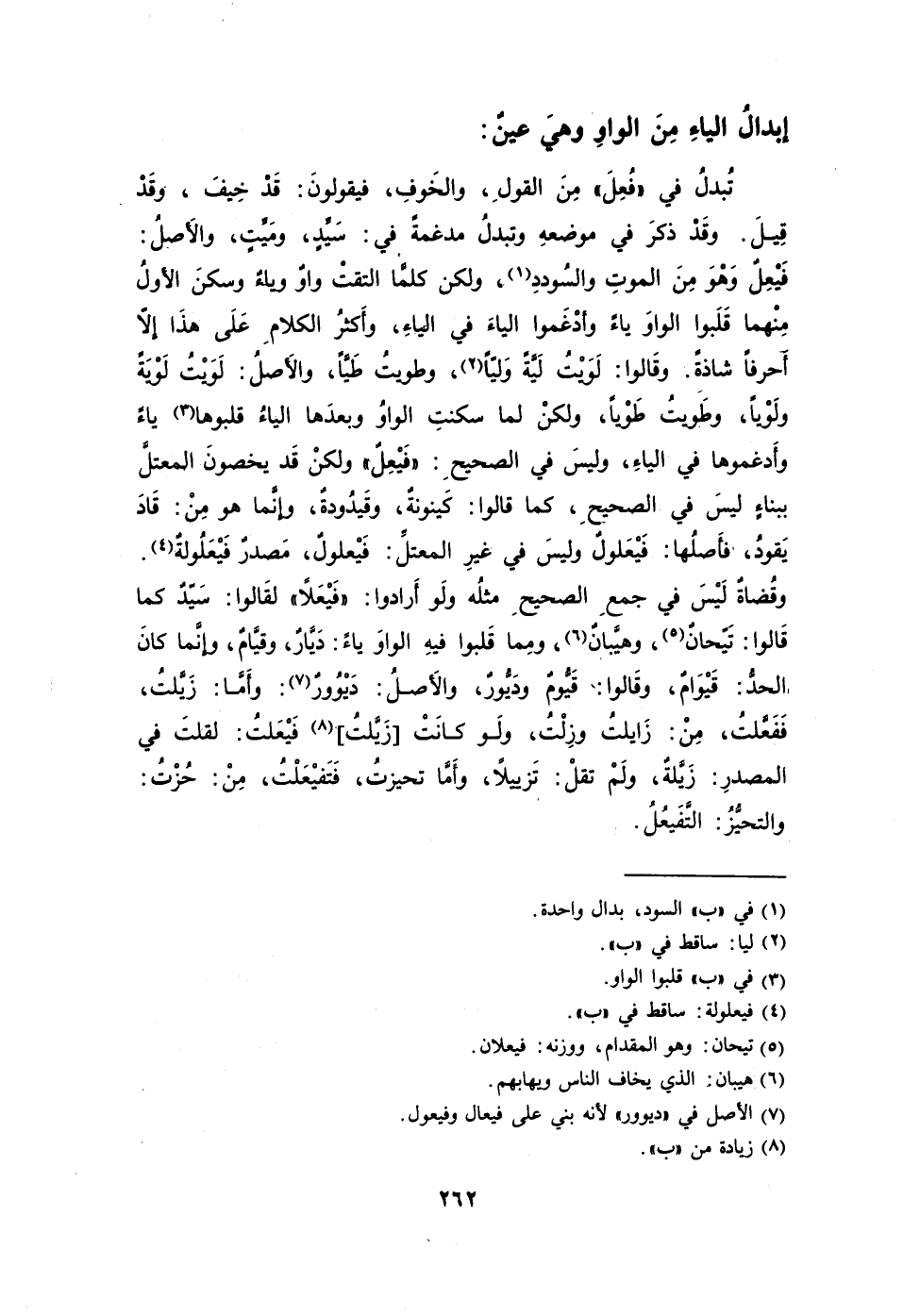 تُبدلُ في "فُعِلَ" مِنَ القولِ والخَوفِ فيقولونَ: قَدْ خِيفَ وقَدْ قِيلَ. وقَدْ ذكرَ في موضعهِ وتبدلُ مدغمةً في: سَيِّدٍ ومَيِّتٍ والأَصِلُ: فَيْعِلٌ وَهْوَ مِنَ الموتِ والسُوددِ1، ولكن كلمَّا التقتْ واوٌ وياءٌ وسكنَ الأولُ مِنْهما قَلَبوا الواوَ ياءً وأدْغَموا الياءَ في الياءِ وأَكثرُ الكلامِ عَلَى هذَا إلا أَحرفًا شاذةً. وقَالوا: لَوَيْتُ لَيَّةً وَليًّا وطويتُ طَيًَّا والأَصلُ: لَوَيْتُ لَوْيَةً ولَوْياً2، وطَويتُ طَوْيًا ولكنْ لما سكنتِ الواوُ وبعدَها الياءُ قلبوها3 ياءً وأَدغموها في الياءِ وليسَ في الصحيحِ: "فَيْعِلٌ" ولكنْ قَد يخصونَ المعتلَّ ببناءٍ ليسَ في الصحيحِ كما قالوا: كَينونةٌ وقَيدُودةٌ وإنَّما هو مِنْ: قَادَ يَقودُ فأَصلُها: فَيْعَلولٌ وليسَ في غيرِ المعتلِّ: فَيْعلولٌ مَصدرٌ فَيْعَلُولةٌ4. وقُضاةٌ لَيْسَ في جمعِ الصحيحِ مثلُه ولَو أَرادوا: "فَيْعَلًا" لقَالوا: سَيّدٌ كما قَالوا: تَيّحانٌ5، وهيَّبانٌ6 ومِما قَلبوا فيهِ الواوَ ياءً: دَيَّارٌ وقيَّامٌ وإنَّما كانَ الحدُّ: قَيْوَامٌ وقَالوا: قَيُّومٌ ودَيُّورٌ والأَصلُ: دَيْوُورٌ7: وأَمَّا: زَيَّلتُ فَفَعَّلتُ مِنْ: زَايلتُ وزِلْتُ ولَو كانَتْ [زَيَّلتُ] 8 فَيْعَلتُ: لقلتَ في المصدرِ: زَيَّلةٌ ولَمْ تقلْ: تَزييلًا وأَمَّا تحيزتُ فَتَفيْعَلْتُ مِنْ: حُزْتُ: والتحيُّزُ: التَّفَيعُلُ.