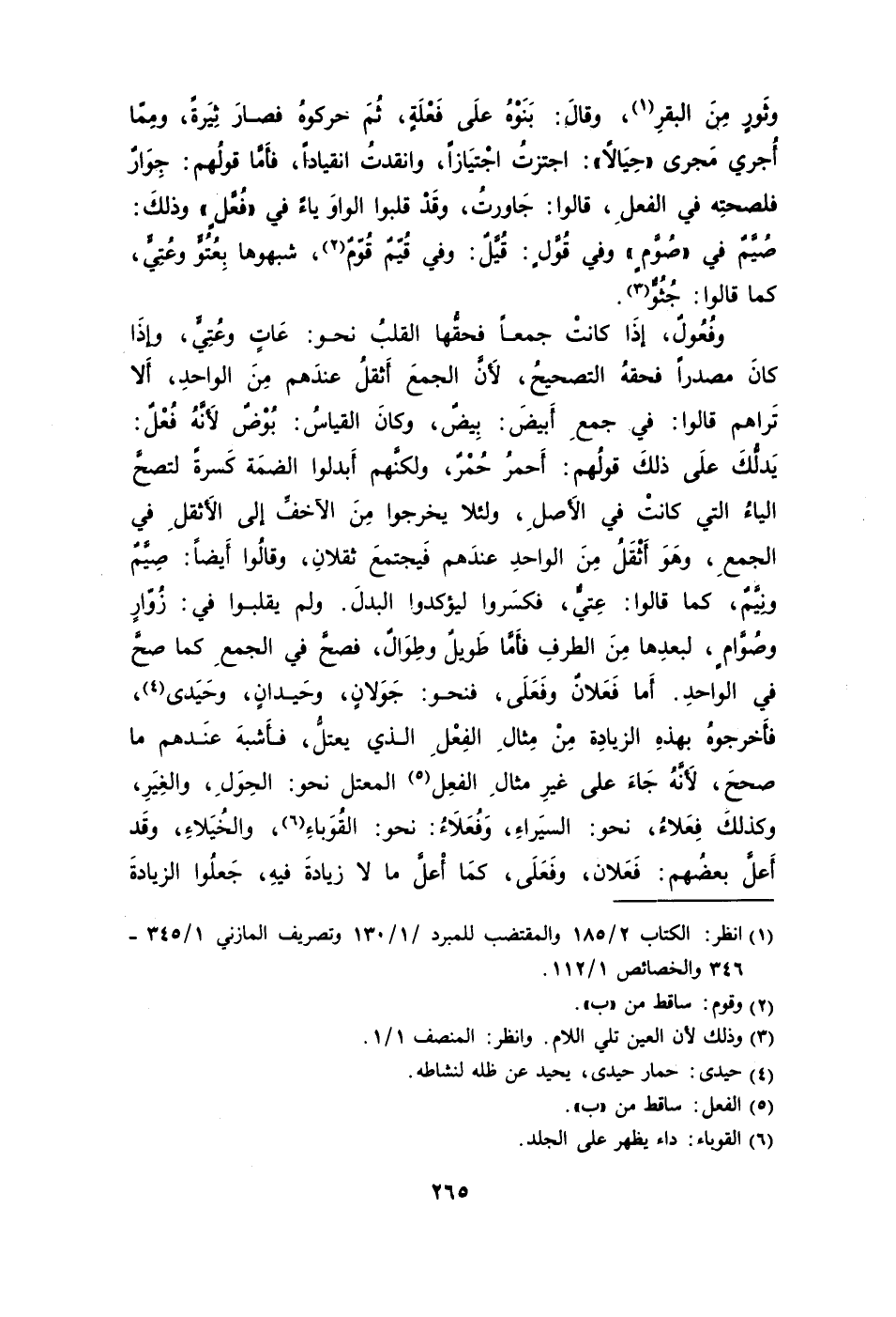 وفُعُولٌ إذَا كانتْ جمعًا فحقُّها القلبُ نحو: عَاتٍ وعُتِيٍّ وإذَا كانَ مصدرًا فحقهُ التصحيحُ لأَنَّ الجمعَ أَثقلُ عندَهم مِنَ الواحدِ أَلا تَراهم قالوا: في جمعِ أَبيضَ: بِيضٌ وكانَ القياسُ: بُوضٌ لأَنَّهُ فُعْلٌ: يَدلُّكَ علَى ذلكَ قولُهم: أَحمرُ حُمْرٌ ولكنَّهم أَبدلوا الضمَة كَسرةً لتصحَّ الياءُ التي كانتْ في الأَصلِ ولئلا يخرجوا مِنَ الآخفِّ إلى الأَثقلِ في الجمعِ وهَوَ أَثْقَلُ مِنَ الواحدِ عندَهم فَيجتمعَ ثقلانِ وقالُوا أيضًا: صِيَّمٌ ونِيَّمٌ كما قالوا: عِتيٌّ فكسَروا ليؤكدوا البدلَ. ولم يقلبوا في: زُوّارٍ وصُوَّامٍ لبعدِها مِنَ الطرفِ فأَمَّا طَويلٌ وطِوَالٌ فصحَّ في الجمعِ كما صحَّ في الواحِد. أَما فَعَلانٌ وفَعَلَى فنحو: جَوَلانٍ وحَيدانٍ وحَيَدى4، فأَخرجوهُ بهذهِ الزيادِة مِنْ مِثالِ الفِعْلِ الذي يعتلُّ فأشبهَ عنَدهم ما صححَ لأَنَّهُ جَاءَ على غيرِ مثالِ الفعِل5 المعتل نحو: الحِوَلِ والغِيَرِ وكذلكَ فِعَلاءُ نحو: السيَراءِ وَفُعَلاَءُ: نحو: القُوَباءِ والخُيَلاءِ وقَد وكذلكَ فِعَلاءُ نحو: السيَراءِ وَفُعَلاَءُ: نحو: القُوَباءِ6 والخُيَلاءِ وقَد أَعلَّ بعضُهم: فَعَلان وَفَعَلَى كمَا أْعلَّ ما لا زيادةَ فيهِ جَعلُوا الزيادةَ.