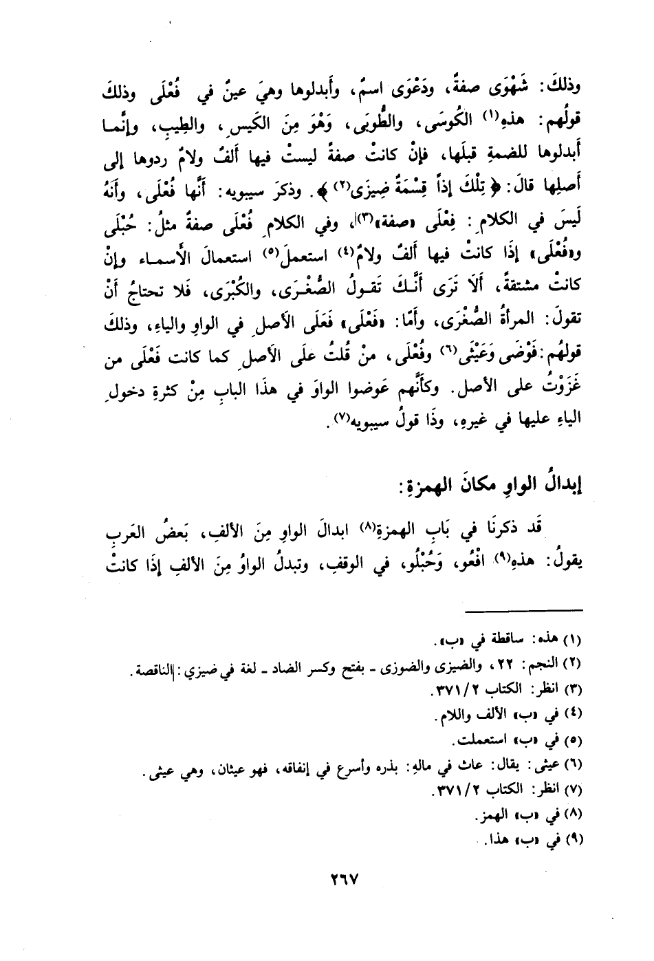 وذلكَ: شَهْوَى صفةٌ ودَعْوَى اسمٌ وأَبدلوها وهيَ عينٌ في فُعْلَى وذلكَ قولُهم: هذهِ1 الكُوسَى والطُّوبَى وَهْوَ مِنَ الكَيسِ والطِيبِ وإنَّما أَبدلوها للضمةِ قبلَها فإنْ كانتْ صفةً ليستْ فيها أَلفٌ ولامٌ ردوها إلى أَصلِها قالَ: {تِلْكَ إذًا قِسْمَةٌ ضِيزَى} 2. وذكرَ سيبويه: أَنَّها فُعْلَى وأَنَهُ لَيسَ في الكلامِ: فِعْلَى "صفة"3، وفي الكلامِ فُعْلَى صفةٌ مثلُ: حُبْلَى و"فُعْلَى" إذَا كانتْ فيها أَلفٌ ولامٌ4 استعملَ5 استعمالَ الأَسماء وإنْ كانتْ مشتقةً أَلاَ تَرَى أَنَّكَ تَقولُ الصَّغْرَى والكُبْرَى فَلا تحتاجُ أَنْ تقولَ: المرأةُ الصُّغْرَى وأَمّا: "فَعْلَى" فَعَلَى الأَصلِ في الواوِ والياءِ وذلكَ قولُهم: فَوْضَى وَعَيْثَى6 وفُعْلَى منْ قُلتُ علَى الأَصلِ كما كانت فَعْلَى من غَزَوْتُ على الأصل. وكأَنَّهم عَوضوا الواوَ في هذَا البابِ مِنْ كثرةِ دخولِ الياءِ عليها في غيرهِ وذَا قولُ سيبويه7.