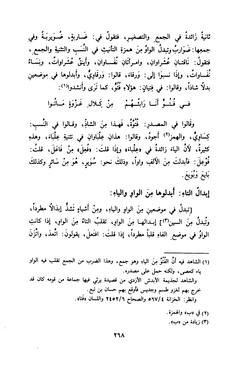 ثانيةً زَائدةً في الجمعِ والتصغيرِ فتقولُ في: ضَاربةٍ ضُوَيربَةٌ وفي جمعِها: ضَوَاربُ وتبدلُ الواوُ مِنَ همزةِ التأنيثِ في النَّسَبِ والتثنيةِ والجمعِ فتقولُ: نَاقتانِ عُشَراوانِ وامرأتَانِ نُفَساوانِ وأَينقٌ عُشَراواتٌ ونِسَاءٌ نُفَساواتٌ وإذَا نسبوَا إلى: وَرقاءَ قالوا: وَرقَاوِيٌّ وأَبدلوها في موضعينِ بدلًا شاذًا وقالوا: في فِتيانٍ: هؤلاءِ فُتُوَّ كما تَرَى وأَنشدوا1: