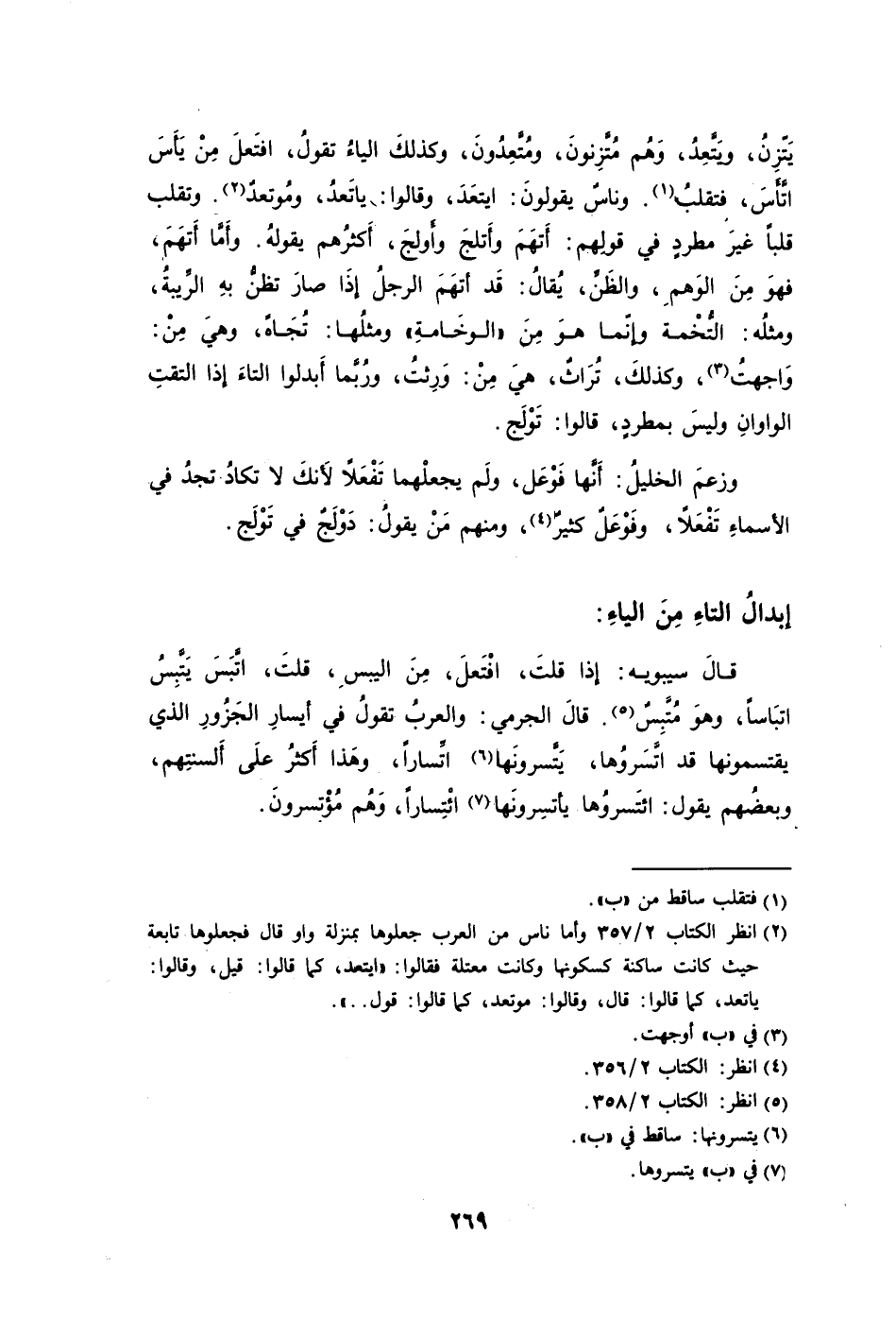 يَتّزِنُ ويَتَّعِدُ وَهُم مُتَّزِنونَ ومُتَّعِدُونَ وكذلكَ الياءُ تقولُ افتَعلَ مِنْ يَأَسَ اتَّأَسَ فتقلبُ1. وناسٌ يقولونَ: ايتعَدَ وقالوا: ياتَعدُ ومُوتعدٌ2. وتقلب قلبًا غيرَ مطردٍ في قولِهم: أَتهَمَ وأَتلجَ وأَولجَ أَكثرُهم يقولهُ. وأَمَّا أَتهَمَ فهوَ مِنَ الوَهمِ والظَنِّ يُقالُ: قَد أتهَمَ الرجلُ إذَا صارَ تظنُّ بهِ الرِّيبةُ ومثلُه: التُّخْمة وإنّما هوَ مِنَ "الوخَامةِ" ومثلُها: تُجَاهٌ وهيَ مِنْ: وَاجهتُ3 وكذلكَ تُرَاثٌ هيَ مِنْ: وَرِثتُ ورُبَّما أَبدلوا التاءَ إذا التقتِ الواوانِ وليسَ بمطردٍ قالوا: تَوْلَج.