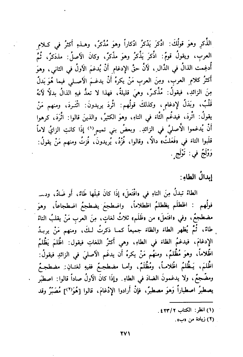 الطاءُ تبدلُ مِنَ التاءِ في "افْتَعلَ" إذَا كانَ قبلَها طَاءٌ أَو ضَادٌ وذلكَ قولُهم: اظطلَم يظطلمُ اظطلامًا واضطجعَ يضطجعُ اضطجاعًا وهوَ مضطجعٌ وفي "افتَعلَ" من "ظَلَم" ثلاثُ لغاتٍ مِنَ العربِ مَنْ يقلبُ التاءُ طاءً ثُمَّ يُظهر الطاءَ والظاءَ جميعًا كما ذكرتُ لكَ ومنهم مَنْ يريدُ الإِدغامَ فيدغمُ الظاءَ في الطاءِ وهي أَكثرُ اللغاتِ فيقول: اظَّلمَ يَظَّلمُ اظّلامًا وهوَ مُظَّلمٌ ومنهُم مَنْ يكرهُ أَن يدغَم الأَصليَ في الزائِد فيقولُ: اظَّلمَ يَظَّلمُ اظّلامًا ومُظَّلَمٌ وأما مضطجعٌ ففيهِ لغتانِ: مضطجعٌ ومضّجعٌ ولا يدغمونَ الضادَ في الطاءِ