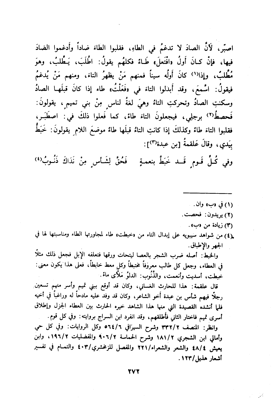 اصبّر لأَنَّ الصادَ لا تدغمُ في الطاءِ فقلبوا الطاءَ ضادًا وأَدغموا الضادَ فيها فإنْ كانَ أَولُ "افْتَعلَ" طَاءً فكلهُم يقولُ: اطَّلَبَ يَطَّلبُ وهوَ مُطَّلبٌ وإذا1 كانَ أَولُه سينًا فمنهم مَنْ يظهرُ التاءَ ومنهم مَنْ يُدغمُ فيقولُ: اسَّمعَ وقد أَبدلوا التاءَ في "فَعَلْتُ" طاء إذا كانَ قبلَها الصادُ وسكنتِ الصادُ وتحركتِ التاءُ وهيَ لغةُ لناسٍ مِنْ بني تميمٍ يقولونَ: فَحصطُ2 برجلِي فيجعلونَ التاءَ طاءً كما فَعلوا ذلكَ في: اصطَبَر فقلبوا التاءَ طاءً وكذلكَ إذا كانتِ التاءُ قبلَها طاءٌ موضعَ اللامِ يقولونَ: خَبَطٌ بِيَدي وقالَ عَلقمةُ [بن عبدة] 3: