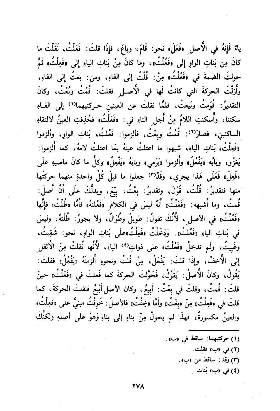 واعلَمْ: أَنَّ كُلَّ كلمةٍ فحقُّها أَن تتركَ على بنائِها الذي بنيتْ عليهِ ولا تُزالُ عنهُ حركاتُها التي بنيتْ عليها ولا يحولُ إلا "فَعَلْتُ" مِما عينهُ واوٌ أَو ياءٌ فَإِنهُ في الأَصلِ "فَعَلَ" نحو: قَامَ وباعَ فإذَا قلتَ: فَعَلْتُ نَقَلْتَ ما كانَ مِن بَناتِ الواوِ إِلى "فَعُلْتُ" وما كانَ مِنْ بَناتِ الياءِ إِلى "فَعِلْتُ" ثَمَّ حولتَ الضمةَ في "فَعُلْتُ" مِنْ: قُلْتُ إلى الفاءِ ومن: بعتُ إِلى الفاءِ وأَزلْتَ الحركةَ التي كانتْ لَها في الأَصلِ فقلتَ: قُمْتُ وبُعْتُ وكانَ التقديرُ: قُوَمتُ وبَيعتْ فلمَّا نقلتَ عن العينينِ حركتيهما1 إلى الفاءِ سكنتا وأُسكنتِ اللامُ مِنْ أَجلِ التاءِ في: "فَعَلْتُ" فحُذِفتِ العينُ لإلتقاءِ الساكنينِ فصار2: قُمْتُ وبِعْتُ فألزموا: فَعُلتُ بَناتِ الواوِ وألزموا "فَعِلْتُ" بَناتِ الياءِ شبهوا ما اعتلتْ عينهُ بمَا اعتلتْ لامهُ كما أَلزموا: يَغزُو وبابُه "يَفْعُلُ" وأَلزموا "يَرْمي" وبابهُ "يَفْعِلُ" وكلُّ ما كانَ ماضيهِ علَى "فَعِلَ" فَعَلَى هَذا يجري وقَدْ3 جعلوا ما قبلَ كُلِّ واحدةٍ منهما حركتَها منها فتقديرُ: قُلْتُ قُوْلَ وتقديرُ: بِعْتُ بِيْعَ ويدلُّكَ علَى أَنَّ أَصلَ: قُمتُ وما أَشبهه: "فَعَلْتُ" أَنَهُ ليسَ في الكلامِ "فَعُلتهُ" فأَمَّا "طُلْتُ" فإِنَّها "فَعُلْتُ" في الأصلِ لأَنَّكَ تقولُ: طويلٌ وطُوَالٌ ولا يجوزُ: طُلْتهُ وليسَ في بَناتِ الياءِ "فَعُلتُ". وَدَخَلْتُ "فَعِلْتُ" علَى بَناتِ الواوِ نحو: شَقِيتُ وغَبِيتُ ولمَ تدخلْ "فَعُلْتُ" على ذواتِ4 الياءِ لأَنَّها نُقلتْ مِنَ الأَثقلِ إِلى الأَخفِّ وإِذَا قلتَ: يَفْعَلُ مِنَ قُلتُ ونحوهِ أَلزمتَهُ "يَفْعَلُ" فقلتَ: يَقُولُ وكانَ الأَصلُ: يَقْوُلُ فَحَوَّلتَ الحركةَ كما فَعلتَ في "فَعَلْتُ" حينَ قلتَ: قُمتُ وقلتَ في بِعْتُ: أَبِيعُ وكان الأصل أَبْيعُ فنقلتَ الحركةَ كما قلتَ في "فَعِلْتُ" مِنْ "بِعْتُ" وأَمَّا "خِفْتُ" فالأصلُ: خَوِفْتُ مبنيٌّ على "فَعِلْتُ" والعينُ مكسورةٌ فهذَا لم يحولْ مِنْ بناءٍ إلى بناءٍ وَهوَ على أصلهِ ولكنَّكَ