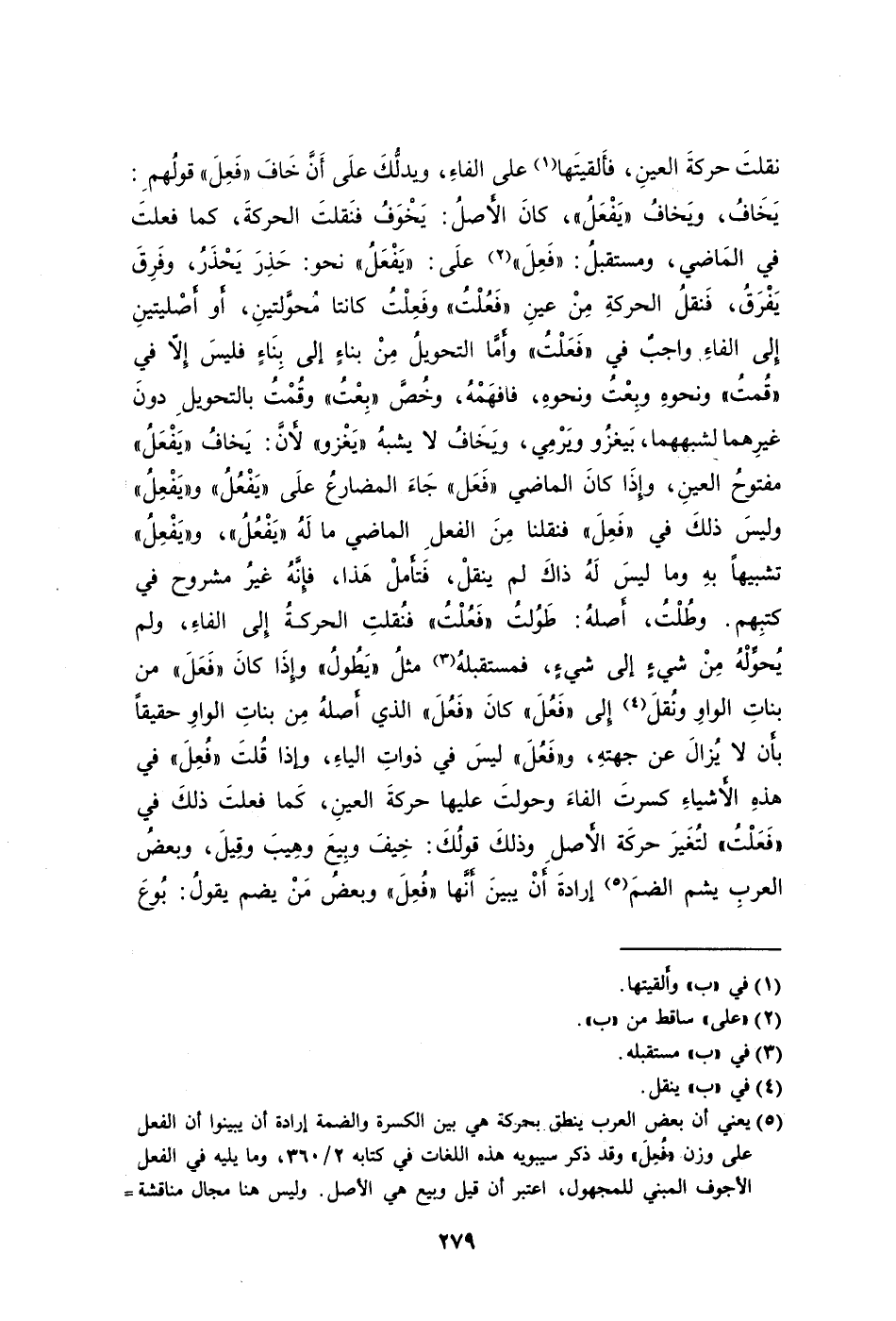 نقلتَ حركةَ العينِ فأَلقيتَها1 على الفاءِ ويدلُّكَ علَى أَنَّ خَافَ "فَعِلَ" قولُهمِ: يَخَافُ ويَخافُ "يَفْعَلُ" كانَ الأَصلُ: يَخْوَفُ فنَقلتَ الحركةَ كما فعلتَ في المَاضي ومستقبلُ: "فَعِلَ"2 علَى: "يَفْعَلُ" نحو: حَذِرَ يَحْذَرُ وفَرِقَ يَفْرَقُ فَنقلُ الحركةِ مِنْ عينِ "فَعُلْتُ" وفَعِلْتُ كانتا مُحوَّلتينِ أَو أَصْليتينِ إِلى الفاءِ واجبٌ في "فَعُلْتُ" وأَمَّا التحويلُ مِنْ بناءٍ إلى بِنَاءٍ فليسَ إلا في "قُمتُ" ونحوهِ وبِعْتُ ونحوهِ فافهَمْهُ وخُصَّ "بِعْتُ" وقُمْتُ بالتحويلِ دونَ غيرِهما لشبههما بَيغزَو ويَرْمِي ويَخَافُ لا يشبهُ "يَغْزو" لأَنَّ: يَخافُ "يَفْعَلُ" مفتوحُ العينِ وإِذَا كانَ الماضي فَعَل جَاءَ المضارعُ علَى يَفْعُلُ ويَفْعِلُ وليسَ ذلكَ في "فَعِلَ" فنقلنا مِنَ الفعلِ الماضي ما لَهُ "يَفْعُلُ" و"يَفْعَلُ" تشبيهًا بهِ وما ليسَ لَهُ ذاكَ لم ينقلْ فَتأَملْ هَذا فإِنَّهُ غيرُ مشروح في كتبِهم. وطُلْتُ أَصلهُ: طَوُلتُ "فَعُلْتُ" فنُقلتِ الحركةُ إِلى الفاءِ ولم يُحوِّلْهُ مِنْ شيءٍ إلى شيءٍ فمستقبلهُ3 مثلُ "يَطُولُ" وإِذَا كانَ "فَعَلَ" من بناتِ الواوِ ونُقلَ إِلى "فَعُلَ" كانَ "فَعُلَ" الذي أَصلهُ مِن بناتِ الواوِ حقيقًا بأن لا يُزالَ عن جهتهِ و"فَعُلَ" ليسَ في ذواتِ الياءِ وإذا قُلتَ "فُعِلَ" في هذهِ الأَشياءِ كسرتَ الفاءَ وحولتَ عليها حركةَ العينِ كَما فعلتَ ذلكَ في "فَعْلْتُ" لتُغَيرَ حركَة الأصلِ وذلكَ قولُكَ: خِيفَ وبِيعَ وهِيبَ وقِيلَ وبعضُ العربِ يشمُ الضمَ إرادةَ أَنْ يبينَ أَنَّها "فُعِلَ" وبعضُ مَنْ يضم يقولُ: بُوعَ