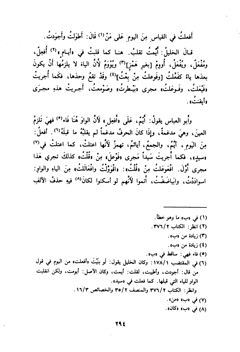 6 في المقتضب 1/ 178: وكان الخليل يقول: لو بنيت "أفعلت" من اليوم في قول من قال: أجودت، وأطيبت، لقلت: أيمت، وكان الأصل: أيومت، ولكن انقلبت الواو للياء التي قبلها. كما فعلت في "سيد".