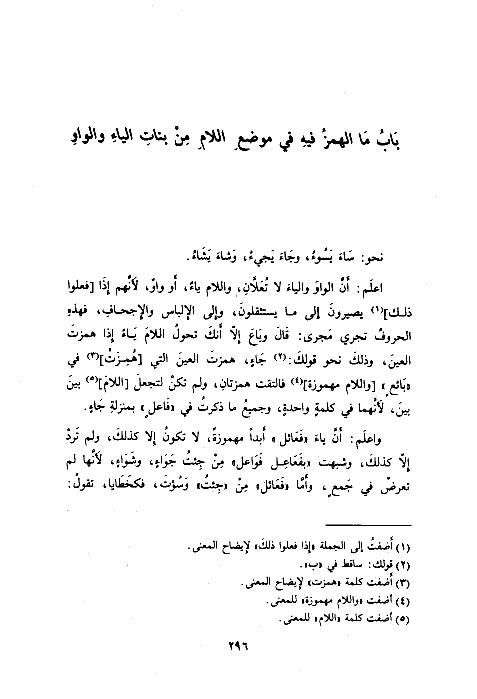 واعلَم: أَنَّ ياءَ "فَعَائل" أَبدًا مهموزةً لا تكونُ إلا كذلكَ ولم تَردْ إلا كذلكَ وشبهت "بفَعَاعِل فَوَاعل" مِنْ جِئتُ جَوَاءٍ وشَوَاءٍ لأَنَّها لم تعرضْ في جَمعٍ وأَمَّا "فَعَائل" مِنْ "جِئتُ" وَسُؤتَ فكخَطَايا تقولُ: