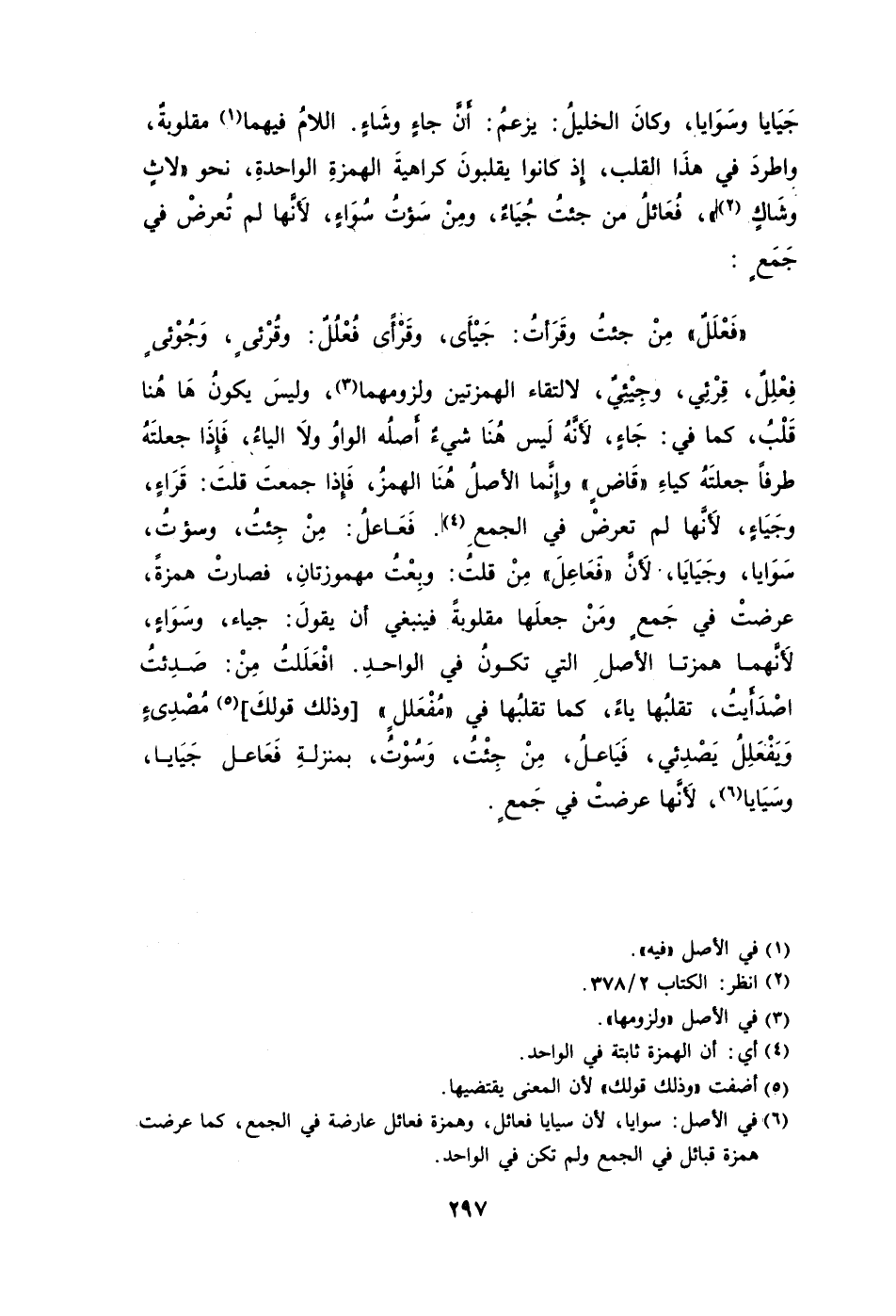 جَيَايا وسَوَايا وكانَ الخليلُ: يزعمُ: أَنَّ جاءٍ وشَاءٍ. اللامُ فيهما1 مقلوبةٌ واطردَ في هذَا القلب إِذ كانوا يقلبونَ كراهيةَ الهمزةِ الواحدةِ نحو"لاثٍ وشَاكٍ2" فُعَائلُ من جئتُ جُيَاءٌ ومِنْ سَؤتُ سُوَاءٍ لأَنَّها لم تُعرضْ في جَمَعٍ: