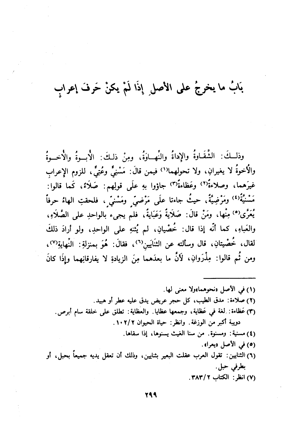 وذلكَ: الشَّقَاوةُ والإِداةُ والنِّهاوَةُ ومِنْ ذلكَ: الأُبوةُ والأُخوةُ والأُخوةُ لا يغيرانِ ولا تحولهما1 فيمن قالَ: مَسْنِيٌّ وعُتِيٌّ للزوم الإِعرابِ غيرَهما وصلاءةٌ2 وعَظاءةٌ3 جاؤوا بهِ علَى قولِهم: صَلاَءٌ كَما قالوا: مَسْنيَّةٌ4 ومَرْضِيَّةٌ حيثُ جاءتا علَى مَرْضيٍّ ومَسْنيٍّ فلحقتِ الهاءُ حرفًا يُعَرَّى5 مِنْها ومَنْ قالَ: صَلاَيةٌ وَعَبَايةٌ فلم يجىء بالواحدِ على الصَّلاَءِ والعَباءِ كما أنّه إذا قال: خُصْيانِ لم يُثنهِ على الواحدِ ولو أرادَ ذلكَ لقال خُصْيتانِ قال وسألته عن الثَنايَينِ6، فقالَ: هُوَ بمنزلةِ: النِّهايةِ7، ومن ثُم قالوا: مِذْرَوانِ لأَنَّ ما بعدَهما مِنَ الزيادةِ لا يفارقانِهما وإِذَا كانَ