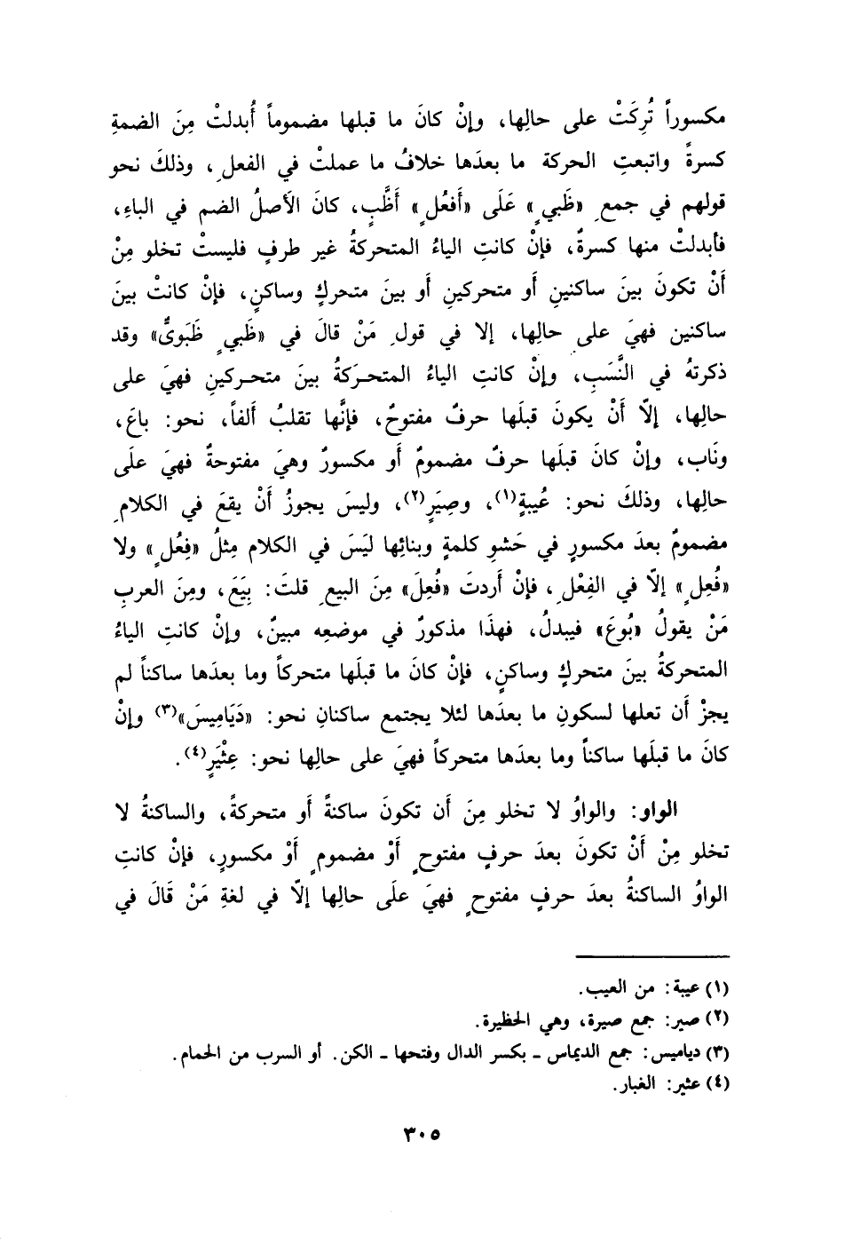 مكسورًا تُرِكَتْ على حالِها وإنْ كانَ ما قبلها مضمومًا أُبدلتْ مِنَ الضمةِ كسرةً واتبعتِ الحركة ما بعدَها خلافُ ما عملتْ في الفعلِ وذلكَ نحو قولهم في جمعِ "ظَبيٍ" عَلَى "أَفعُلٍ" أَظَّبٍ كانَ الأَصلُ الضم في الباءِ فأبدلتْ منها كسرةٌ فإنْ كانتِ الياءُ المتحركةُ غير طرفٍ فليستْ تخلو مِنْ أَنْ تكونَ بينَ ساكنينِ أَو متحركينِ أَو بينَ متحركٍ وساكنٍ فإنْ كانتْ بينَ ساكنين فهيَ على حالِها إلا في قولِ مَنْ قالَ في "ظَبيْ ظَبَويٌّ" وقد ذكرتهُ في النَّسَبِ وإنْ كانتِ الياءُ المتحرَكةُ بينَ متحركينِ فهيَ على حالِها إلا أَنْ يكونَ قبلَها حرفٌ مفتوحٌ فإنَّها تقلبُ ألفًا نحو: باعَ ونَاب وإنْ كانَ قبلَها حرفٌ مضمومٌ أَو مكسورٌ وهيَ مفتوحةٌ فهيَ علَى حالِها وذلكَ نحو: عُيبةٍ1، وصِيَرٍ2 وليسَ يجوزُ أَنْ يقعَ في الكلامِ مضمومٌ بعدَ مكسورٍ في حَشوِ كلمةٍ وبنائِها ليَسَ في الكلامِ مِثلُ "فِعُلٍ" ولا "فُعِلٍ" إلا في الفِعْلِ فإنْ أَردتَ "فُعِلَ" مِنَ البيعِ قلتَ: بِيَعَ ومِنَ العربِ مَنْ يقولُ "بُوعَ" فيبدلُ فهذَا مذكورٌ في موضعِه مبينُ وإنْ كانتِ الياءُ المتحركةُ بينَ متحركٍ وساكنٍ فإنْ كانَ ما قبلَها متحركًا وما بعدَها ساكنًا لم يجزْ أَن تعلها لسكونِ ما بعدَها لئلا يجتمع ساكنانِ نح و"دَيَامِيسَ"3 وإنْ كانَ ما قبلَها ساكنًا وما بعدَها متحركًا فهيَ على حالِها نحو: عِثْيَرٍ4.