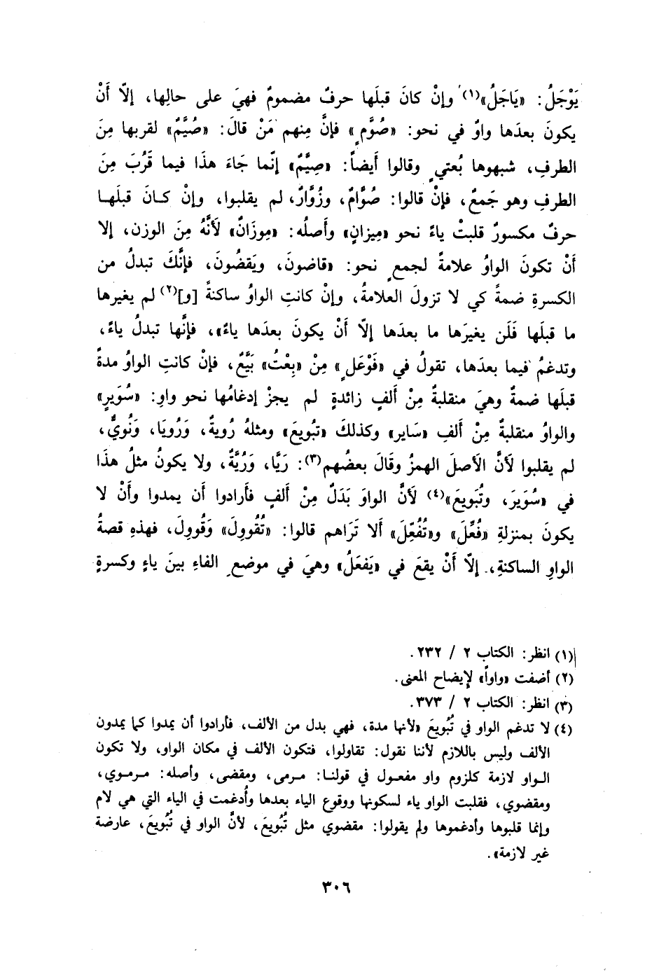 يَوْجَلُ: "يَاجَلُ"1 وإنْ كانَ قبلَها حرفٌ مضمومٌ فهيَ على حالِها إلا أَنْ يكونَ بعدَها واوٌ في نحو: "صُوَّمٍ" فإنَّ مِنهم مَنْ قالَ: "صُيَّمٌ" لقربها مِنَ الطرفِ شبهوها بُعتيٍ وقالوا أَيضًا: "صِيَّمٌ" إنَّما جَاءَ هذَا فيما قَرُبَ مِنَ الطرفِ وهو جَمعٌ فإنْ قالوا: صُوَّامٌ وزُوَّارٌ لم يقلبوا وإنْ كانَ قبلَها حرفٌ مكسورٌ قلبتْ ياءً نح و"مِيزانٍ" وأَصلُه: "مِوزَانٌ" لأَنَّهُ مِنَ الوزن إلا أَنْ تكونَ الواوُ علامةً لجمعٍ نحو: "قاضونَ ويَقضُونَ فإنَّكَ تبدلُ من الكسرةِ ضمةً كي لا تزولَ العلامةُ وإنْ كانتِ الواوُ ساكنةً [و] 2 لم يغيرها ما قبلَها فَلَن يغيرَها ما بعدَها إلا أَنْ يكونَ بعدَها ياءٌ" فإنَّها تبدلُ ياءً وتدغمُ فيما بعدَها تقولُ في "فَوْعَلٍ" مِنْ "بِعْتُ" بَيَّعٌ فإنْ كانتِ الواوُ مدةً قبلَها ضمةٌ وهيَ منقلبةٌ مِنْ أَلفٍ زائدةٍ لم يجزْ إدغامُها نحو واوِ: "سُوَيرٍ" والواوُ منقلبةٌ مِنْ أَلفِ "سَاير" وكذلكَ "تبُويعَ" ومثلهُ رُويةٌ وَرُويَا وَنُويٌّ لم يقلبوا لأَنَّ الأَصلَ الهمزُ وقَالَ بعضُهم3: رَيَّا وَرُيَّةٌ ولا يكونُ مثلُ هذَا في "سُوَيرَ وتُبَويعَ"4 لأَنَّ الواوَ بَدَلٌ مِنْ أَلفٍ فأَرادوا أَن يمدوا وأَنْ لا يكونَ بمنزلةِ "فُعِّلَ" و"تُفُعِّلَ" أَلا تَرَاهم قالوا: "تُقُووِلَ" وَقُووِلَ فهذهِ قصةُ الواوِ الساكنةِ إلا أَنْ يقعَ في "يَفعَلُ" وهَيَ في موضعِ الفاءِ بينَ ياءٍ وكسرةٍ