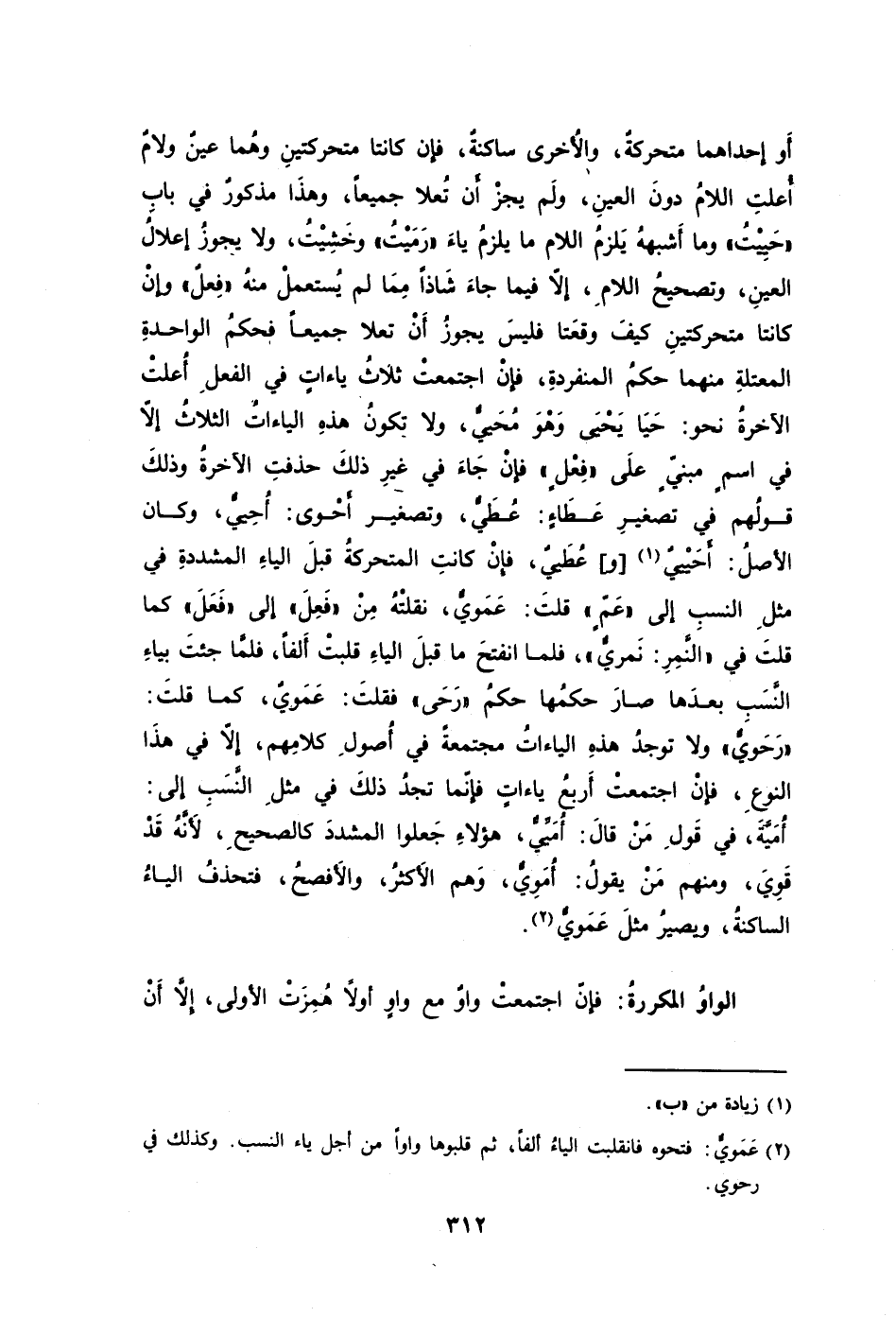 الياءُ مكررة: إذَا اجتمعتِ الياءانِ فلا تخلوانِ مِنْ أَن تكونا متحركتينِ أَو إحداهما متحركةٌ والأُخرى ساكنةٌ فإن كانتا متحركتينِ وهُما عينٌ ولامٌ أُعلتِ اللامُ دونَ العينِ ولَم يجزْ أَن تُعلا جميعًا وهذَا مذكورٌ في بابِ "حَيِيْتُ" وما أَشبههُ يَلزمُ اللام ما يلزمُ ياءَ "رَمَيْتُ" وخَشِيْتُ ولا يجوزُ إعلالُ العينِ وتصحيحُ اللامِ إلا فيما جاءَ شَاذًا مِمَا لم يُستعملْ منهُ "فِعلٌ" وإنْ كانتا متحركتينِ كيفَ وقعَتا فليسَ يجوزُ أَنْ تعلا جميعًا فحكمُ الواحدةِ المعتلةِ منهما حكمُ المنفردةِ فإنْ اجتمعتْ ثلاثُ ياءاتٍ في الفعلِ أُعلتِ الآخرةُ نحو: حَيَا يَحْيَى وَهْوَ مُحَييٌّ ولا تكونُ هذِه الياءاتُ الثلاثُ إلا في اسمٍ مبنيٍّ علَى "فِعْلٍ" فإنْ جَاءَ في غيرِ ذلكَ حذفتِ الآخرةُ وذلكَ قولُهم في تصغيرِ عَطَاءٍ: عَطَيٌّ وتصغير أَحْوى: أُحِييٌّ وكان الأصلُ: أَحَيْييٌ1 [و] عُطَييٌ فإنْ كانتِ المتحركةُ قبلَ الياءِ المشددةِ في مثلِ النسبِ إلى "عَمٍّ" قلتَ: عَمَويٌّ نقلتْهُ مِنْ "فَعِلَ" إلى "فَعَلَ" كما قلتَ في "النَّمِرِ: نَمريٌّ" فلما انفتحَ ما قبلَ الياءِ قلبتْ ألفًا فلمَّا جئتَ بياءِ النَّسَبِ بعدَها صارَ حكمُها حكمُ "رَحَى" فقلتَ: عَمَويٌ كما قلتَ: "رَحَويٌّ" ولا توجدُ هذهِ الياءاتُ مجتمعةً في أُصولِ كلامِهم إلا في هذَا النوعِ فإنْ اجتمعتْ أَربعُ ياءاتٍ فإنّما تجدُ ذلكَ في مثلِ النَّسَبِ إلى: أُمَيَّةَ في قَولِ مَنْ قالَ: أُمَيِّيٌّ هؤلاءِ جَعلوا المشددَ كالصحيحِ لأَنَّهُ قَدْ قَوِيَ ومنهم مَنْ يقولُ: أُمَوِيٌّ وَهم الأَكثرُ والأَفصحُ فتحذفُ الياءُ الساكنةُ ويصيرُ مثلَ عَمَويٌّ2.