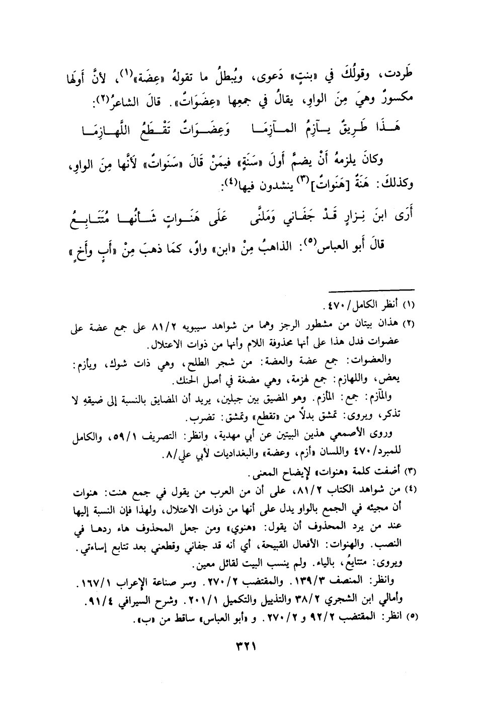 وكانَ يلزمهُ أَنْ يضمَّ أَولَ "سَنَةٍ" فيمَنْ قَالَ "سَنَواتٌ" لأَنَّها مِنَ الواوِ وكذلكَ: هَنَةٌ [هَنَواتٌ] ينشدون فيها4: