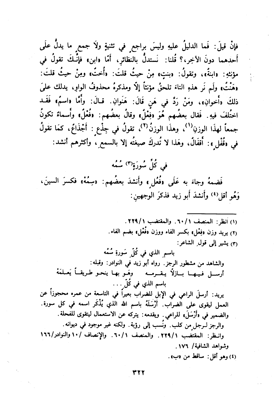 فإنْ قيلَ: فَما الدليلُ عليهِ وليسَ براجعٍ في تثنيةٍ ولاَ جمعٍ ما يدلُّ علَى أَحدهما دونَ الآخِر؟ قُلنا: نَستدلُّ بالنظائرِ أَمَّا "ابن" فإنَّكَ تقولُ في مؤنثهِ: "ابنةٌ" وتقولُ: "بنتٍ" مِنْ حيثُ قلتَ: "أُختٌ" ومِنْ حيثُ قلتَ: "هَنْتٌ" ولمَ نَر هذهِ التاءَ تلحقُ مؤنثًا إلا ومذكرهُ محذوفُ الواوِ يدلك علَى ذلكَ "أَخوانِ" ومَنْ رَدَّ في هَنٍ قَالَ: هَنَوانِ. قالَ: وأَمَّا "اسمٌ" فَقَد اختُلفَ فيهِ. فَقال بعضُهم هَ و"فِعْلٌ" وقالُ بعضُهم: "فُعْلٌ" وأَسماءٌ تكونُ جمعًا لهذَا الوزنِ1، وهذَا الوزنُ2 تقولُ في جِذْعٍ: أَجْذَاعٌ كمَا تقولُ في "قُفْلٍ": أَقفَالٌ وهَذا لا تُدركَ صيغتُه إلا بالسمعِ وأكثرهم أنشد: