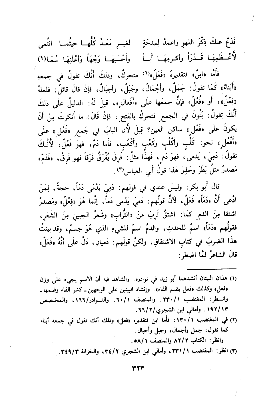 فأَمَّا "ابنٌ" فتقديرهُ "فَعَلٌ"2 متحركٌ وذلكَ أَنَّكَ تقولُ في جمعهِ "أَبَناءُ" كَمَا تقولُ: جَمَلٌ وأَجْمَالٌ وجَبَلٌ وأَجبَالٌ فإنْ قالَ قائلٌ: فلعلهُ "فِعْلٌ" أَو"فُعْلٌ" فإنَّ جمعَها علَى "أَفَعالٍ" قيلَ لَهُ: الدليلُ عَلى ذلكَ أَنَّكَ تقولُ: بَنُونَ في الجمعِ فتحركُ بالفتحِ فإنْ قَالَ: ما أَنكرتَ مِنْ أَنْ يكونَ علَى "فَعْلٍ" ساكن العين قِيلَ لأَن البابَ في جَمعِ "فَعْلٍ" علَى "أَفْعُلٍ" نحو: كَلْبٍ وأَكْلُبٍ وكَعْبٍ وأَكْعُبٍ فأَما دَمٌ فهوَ فَعْلٌ لأَنَّكَ تقولُ: دَمِيَ يَدمى فهوَ دَمٍ فَهذَا مثلُ: فَرِقَ يُفْرَقُ فَرَقًا فهو فَرِقٌ "فَدَمٌ" مَصدرٌ مثلُ بَطَرَ وحَذِرَ هَذا قولُ أَبي العباس3.