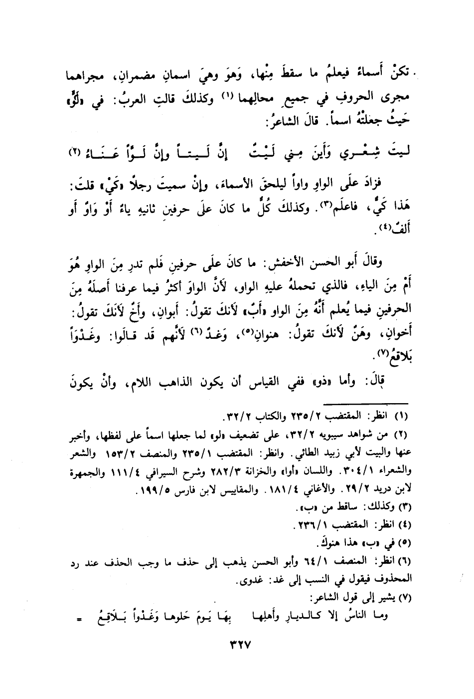 وقالَ أَبو الحسن الأخفش: ما كانَ علَى حرفينِ فَلم تدرِ مِنَ الواوِ هَوَ أَمْ مِنَ الياءِ فالذي تحملهُ عليهِ الواو لأَنَّ الواوَ أكثرُ فيما عرفنا أَصلَهُ مِنَ الحرفينِ فيما يُعلم أَنَّهُ مِنَ الوا و"أَبٌ" لأَنكَ تقولُ: أَبوانِ وأَخٌ لأَنَكَ تقولُ: أَخوانِ وهَنٌ لأَنكَ تقولُ: هنوانِ5، وَغدٌ6 لأَنَّهم قَد قالَوا: وغَدْوًا بَلاقعُ7.