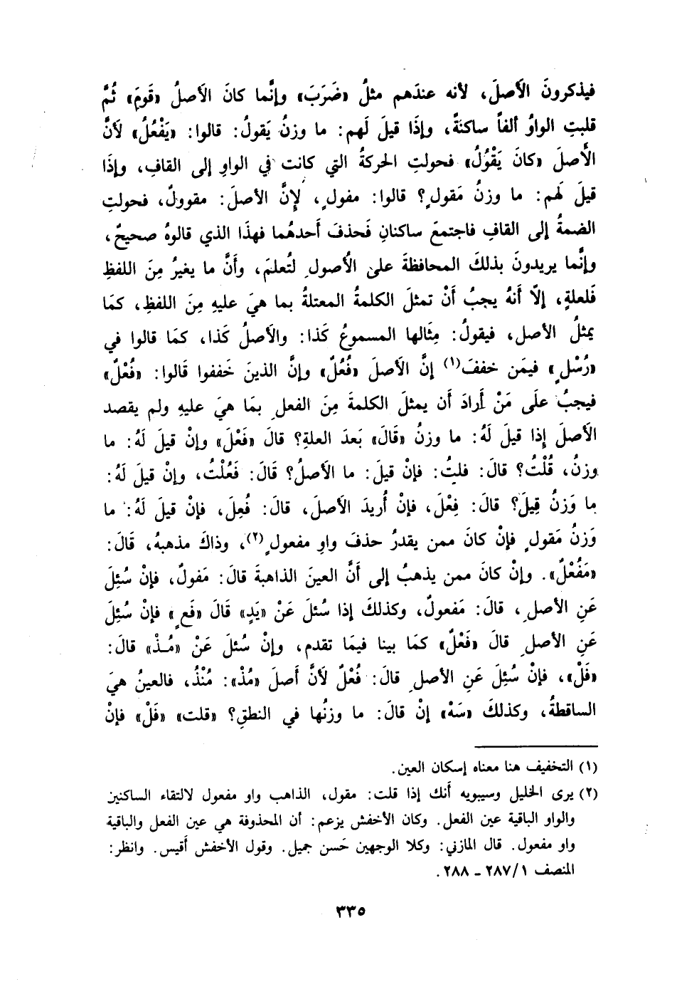 فيذكرونَ الأَصلَ لأنه عندَهم مثلُ "ضَرَبَ" وإنَّما كانَ الأَصلُ "قَوِمَ" ثُمَّ قلبتِ الواوُ ألفًا ساكنةً وإذَا قيلَ لَهم: ما وزنُ يَقولُ: قالوا: "يَفْعُلُ" لأَنَّ الأَصلَ "كانَ يَقْوُلُ" فحولتِ الحركةُ التي كانت في الواوِ إلى القافِ وإذَا قيلَ لَهم: ما وزنُ مَقولٍ؟ قالوا: مفولٍ لإِنَّ الأَصلَ: مقوولٌ فحولتِ الضمةُ إلى القافِ فاجتمعَ ساكنانِ فَحذفَ أَحدهُما فهذَا الذي قالوهُ صحيحٌ وإنِّما يريدونَ بذلكَ المحافظةَ على الأُصولِ لتُعلمَ وأَنَّ ما يغيرُ مِنَ اللفظِ فَلعلةٍ إلا أَنهُ يجبُ أَنْ تمثلَ الكلمةُ المعتلةُ بما هيَ عليهِ مِنَ اللفظِ كمَا يمثلُ الأصل فيقولُ: مِثَالها المسموعُ كَذا: والأَصلُ كَذا كمَا قالوا في "رُسْلٍ" فيمَن خففَ1، إنَّ الأَصلَ "فُعُلٌ" وإنَّ الذينَ خَففوا قَالوا: "فُعْلٌ" فيجبُ علَى مَنْ أَرادَ أَن يمثلَ الكلمةَ مِنَ الفعلِ بمَا هيَ عليِه ولم يقصد الأَصلَ إِذا قيلَ لَهُ: ما وزنُ "قَالَ" بَعدَ العلةِ قالَ "فَعْلَ" وإنْ قيلَ لَهُ: ما وزنُ قُلْتُ قالَ: فلتُ: فإنْ قيلَ: ما الأَصلُ قَالَ: فَعُلْتُ قيلَ لَهُ: ما وَزنُ قِيلَ قالَ: فِعْلَ فإنْ أَريدَ الأَصلَ قالَ: فُعِلَ فإنْ قيلَ لَهُ: ما وَزنُ مَقولٍ فإنْ كانَ ممن يقدرُ حذفَ واوِ مفعولٍ2، وذاكَ مذهبهُ قَالَ "مَفُعْلٌ". وإنْ كانَ ممن يذهبُ إلى أَنَّ العينَ الذاهبةَ قالَ: مَفولٌ فإنْ سُئلَ عَنِ الأصلِ قالَ: مَفعولٌ وكذلكَ إذا سُئلَ عَنْ "يَدٍ" قَالَ "فَعٍ" فإنْ سُئِلَ عَنِ الأصلِ قالَ "فَعْلٌ" كمَا بينا فيمَا تقدم وإنْ سُئلَ عَنْ "مُذْ" قالَ: "فَلْ" فإنْ سُئِلَ عَنِ الأصلِ قالَ: فُعْلٌ لأَنَّ أصلَ "مُذْ": مُنْذُ فالعينُ هيَ الساقطةُ وكذلكَ: "سَهْ" إنْ قالَ: ما وزنُها في النطقِ "قلت" "فَلْ" فإنْ