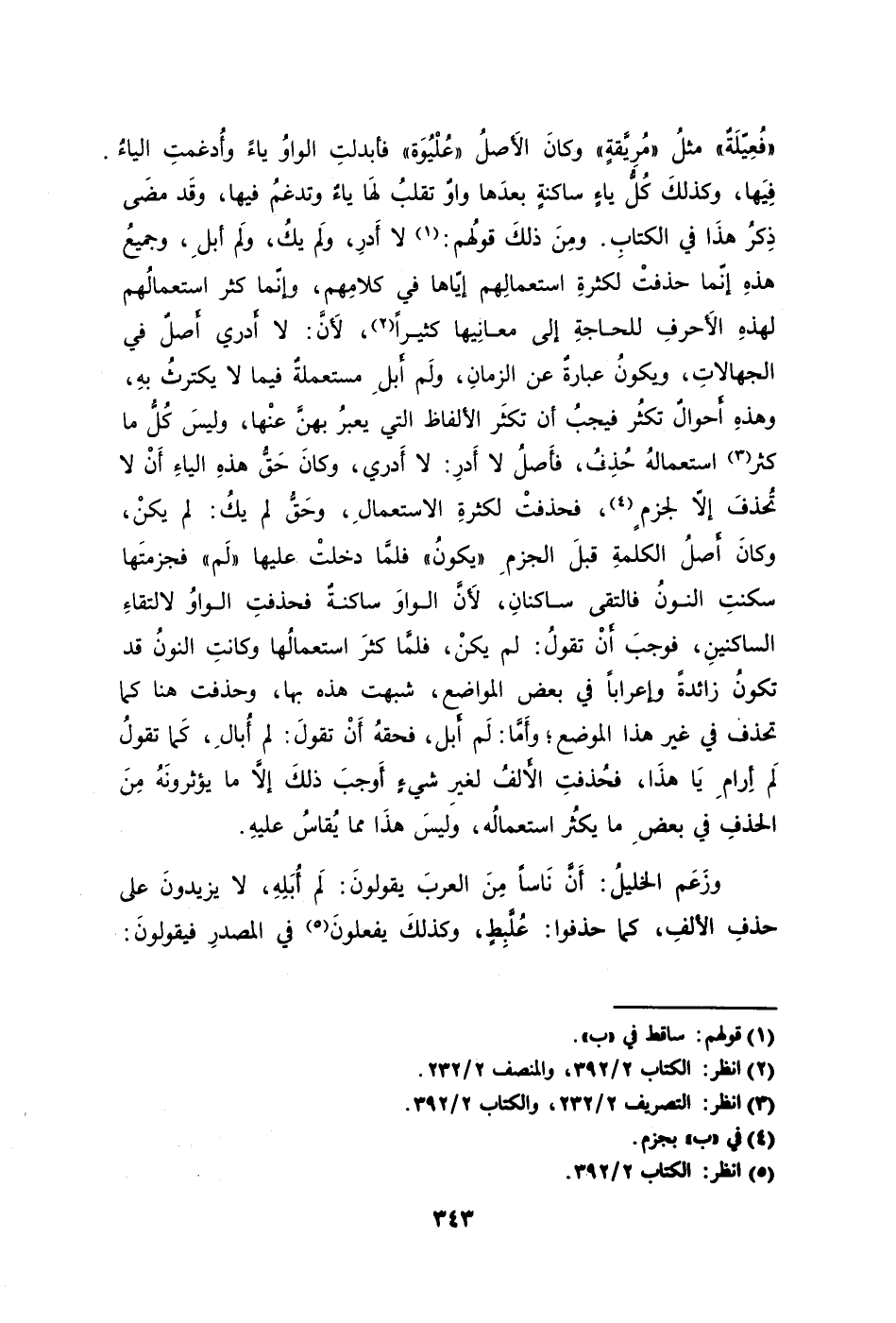وزَعَم الخليلُ: أَنَّ نَاسًا مِنَ العربَ يقولونَ: لَم أُبَلِهِ لا يزيدونَ على حذفِ الألفِ كما حذفوا: عُلَّبِطٍ وكذلكَ يفعلونَ5 في المصدرِ فيقولونَ: