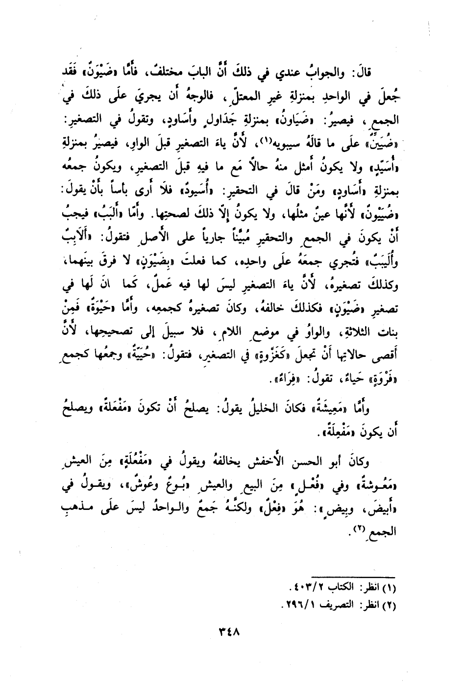 وكانَ أبو الحسن الأَخفش يخالفهُ ويقولُ في "مَفْعُلَةٍ" مِنَ العيشِ "مَعُوشةٌ" وفي "فُعْلٍ" مِنَ البيعِ والعيشِ "بُوعٌ وعُوشٌ" ويقولُ في "أَبيضَ وبِيضٍ": هو"فِعْلٌ" ولكنَّهُ جَمعٌ والواحدُ ليسَ علَى مذهبِ الجمعِ2.