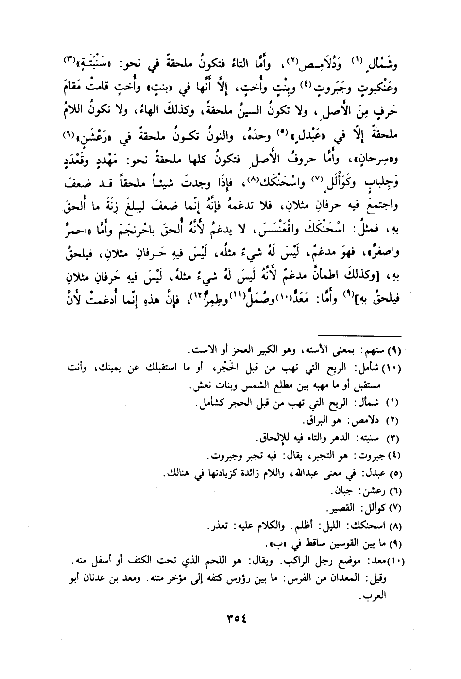 وشَمْأَلٍ1 وَدُلاَمِص2، وأَمَّا التاءُ فتكونُ ملحقةً في نحو: "سَنْبَتَةٍ"3 وعَنْكبوتٍ وجَبَروتٍ4 وبِنْتٍ وأًختٍ إلا أَنَّها في "بنتٍ" وأُختٍ قامتْ مَقامَ حَرفٍ مِنَ الأَصلِ ولا تكونُ السينُ ملحقةً وكذلكَ الهاءُ ولا تكونُ اللامُ ملحقةً إلا في "عَبْدلٍ5" وحدَهُ والنونُ تكونُ ملحقةً في "رَعْشَنٍ"6 و"سِرحانٍ" وأَمَّا حروفُ الأَصلِ فتكونُ كلها ملحقةً نحو: مَهْددٍ وقَعْدَدٍ وَجِلبابٍ وكَوَأْلَلٍ7 واسْحَنْكَك8، فإِذَا وجدتَ شيئًا ملحقًا قد ضعفَ واجتمعَ فيه حرفانِ مثلانِ فلا تدغمهُ فإنَّهُ إِنّما ضعفَ ليبلغَ زِنَةَ ما أُلحقَ بهِ فمثلُ: اسْحَنْكَكَ واقْعَنْسَسَ لا يدغمُ لأَنَّهُ أُلحقَ باحْرنجَمَ وأَمَّا "احمرَّ واصفرَّ" فهوَ مدغمُ لَيْسَ لَهُ شيءٌ مثلُه لَيْسَ فيهِ حَرفانِ مثلانِ فيلحقُ بهِ [وكذلكَ اطمأنَّ مدغمٌ لأَنَّهُ لَيسَ لَهُ شيءٌ مثلهُ لَيْسَ فيهِ حَرفانِ مثلانِ فيلحقُ بهِ] 9 وأَمَّا: مَعَدُّ10 وصُمَلٌّ11 وطِمِرٌّ12، فإِنَّ هذهِ إِنّما أُدغمتْ لأَنَّ