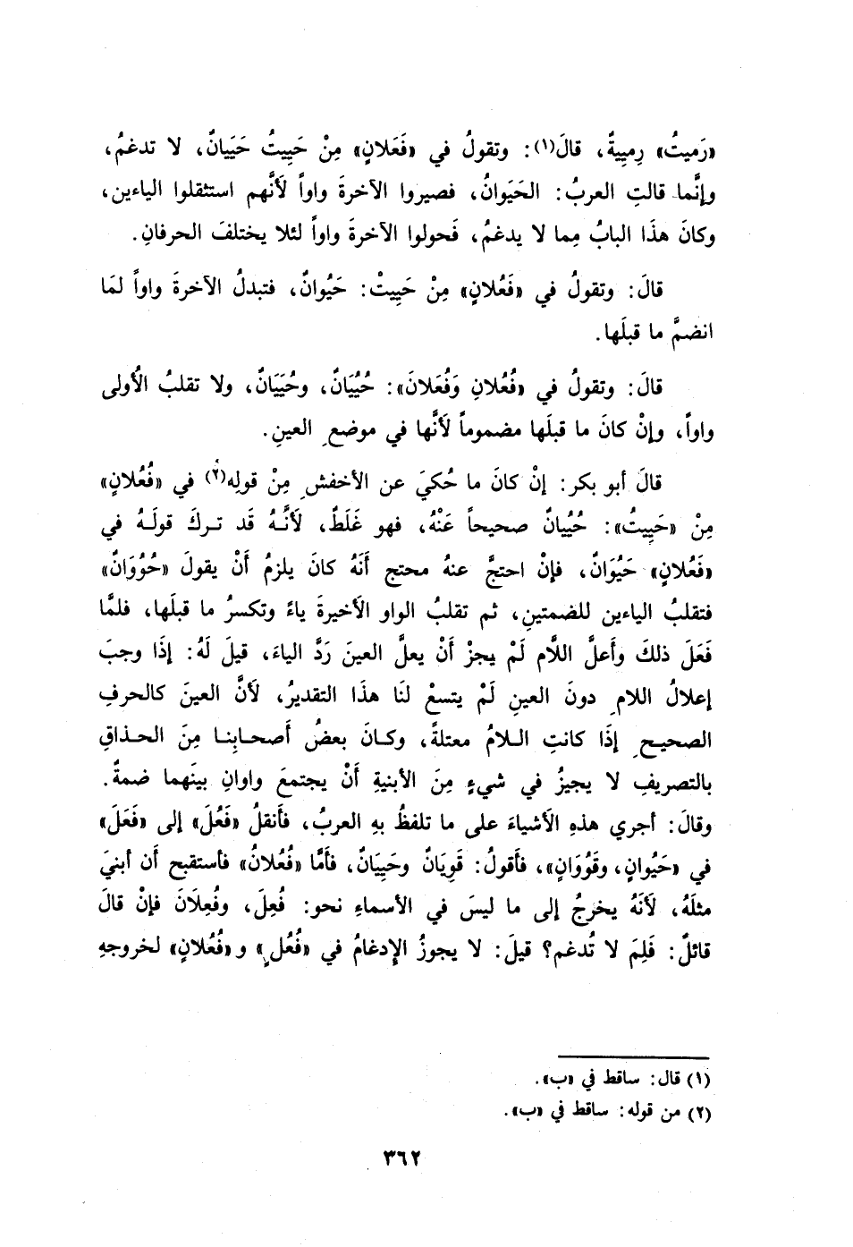 قالَ: وتقولُ في "فَعُلانٍ" مِنْ حَيِيتْ: حَيُوانٌ فتبدلُ الآخرةَ واوًا لمَا انضمَّ ما قبلَها.