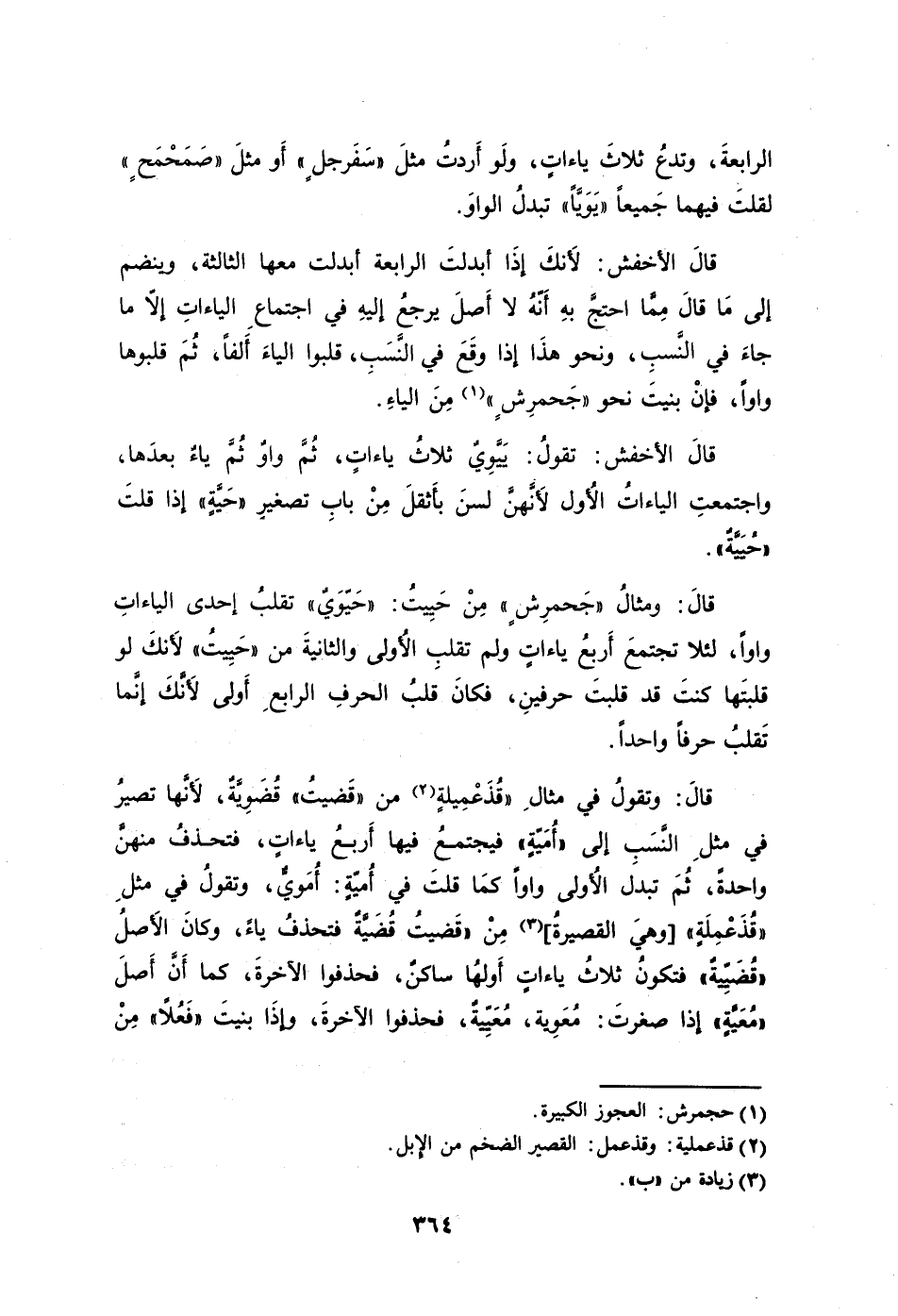قالَ الأخفش: لأَنكَ إذَا أبدلتَ الرابعة أبدلت معها الثالثة وينضم إلى مَا قالَ مِمَّا احتجَّ بهِ أَنّهُ لا أَصلَ يرجعُ إليهِ في اجتماعِ الياءاتِ إلا ما جاءَ في النَّسبِ ونحو هذَا إذا وقَعَ في النَّسَبِ قلبوا الياءَ ألفًا ثُمَ قلبوها واوًا فإنْ بنيتَ نح و"جحمرِشٍ"1 مِنَ الياءِ.