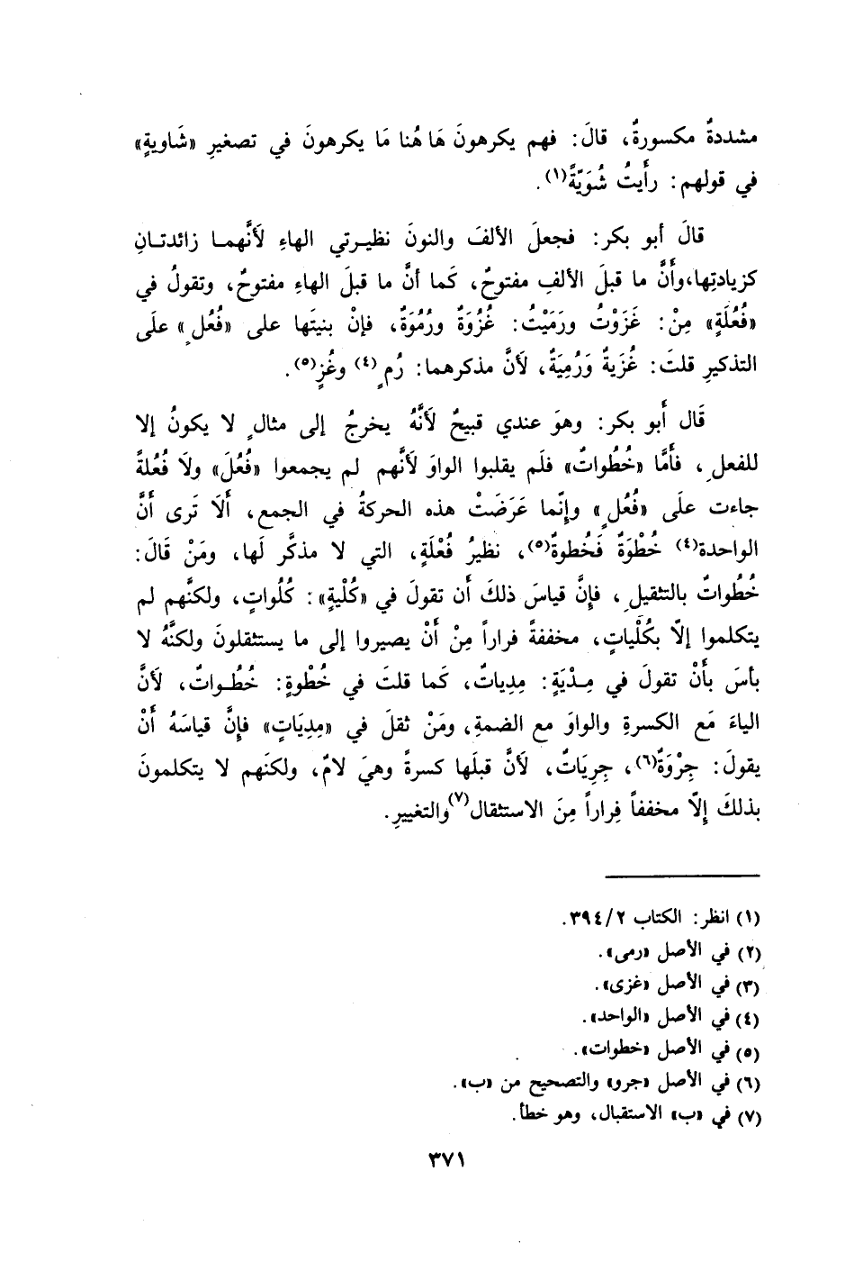 قالَ أبو بكر: فجعلَ الألفَ والنونَ نظيرتي الهاءِ لأَنَّهما زائدتانِ كزيادتِها وأَنَّ ما قبلَ الألفِ مفتوحٌ كَما أنَّ ما قبلَ الهاءِ مفتوحٌ وتقولُ في "فُعُلَةٍ" مِنْ: غَزَوْتُ ورَمَيْتُ: غُزُوَةٌ ورُمُوَةٌ فإنْ بنيتَها على "فُعُلٍ" علَى التذكيرِ قلتَ: غُزَيةٌ وَرُمِيَةٌ لأَنَّ مذكرهما: رُمٍ2 وغُزٍ3.