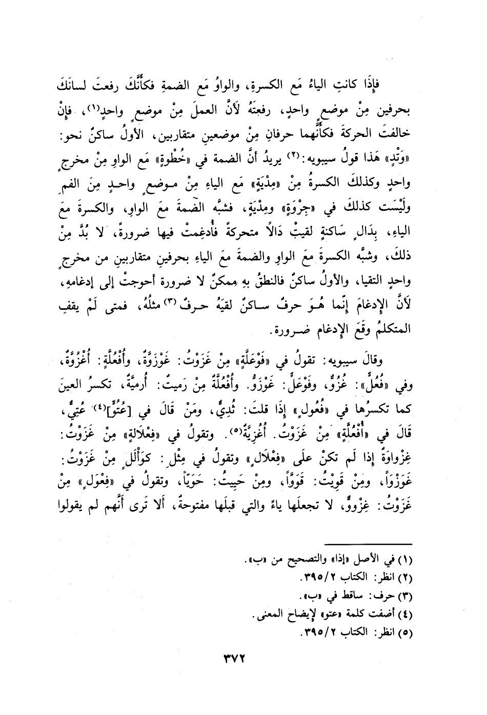وقالَ سيبويه: تقولُ في "فَوْعَلَّةٍ" مِنْ غَزَوْتُ: غَوْزَوَّةٌ وأُفْعُلَّةٍ: أُغْزَوَّةٌ وفي "فُعُلٍّ": غُزُوٌّ وفَوْعُلٍّ: غَوَزَوٌّ. وأُفْعُلَّةٌ مِنْ رَميتٌ: أُرميَّةٌ تكسرُ العينَ كما تكسرُها في "فُعُولٍ" إِذَا قلتَ: ثُدِيٌّ ومَنْ قَالَ في [عُتُوٍّ] 4 عُتيٌِّ قَالَ في "أُفْعُلَّةٍ" مِنْ غَزَوْتُ. أُغُزِيَّةٌ5. وتقولُ في "فِعْلاَلةٍ" مِنْ غَزَوْتُ: غِزْواوَةٌ إِذا لَم تكنْ علَى "فِعْلاَلٍ" وتقولُ في مِثْلِ: كوَأْلَلٍ مِنْ غَزَوْتُ: غَوَزْوًَا ومِنْ قَوِيْتُ: قَوَوًَّا ومِنْ حَيِيتُ: حَوَيًّا وتقولُ في "فِعْوَلٍ" مِنْ غَزَوْتُ: غِزْووٌّ لا تجعلَها ياءً والتي قبلَها مفتوحةٌ أَلا تَرى أَنَّهم لم يقولوا