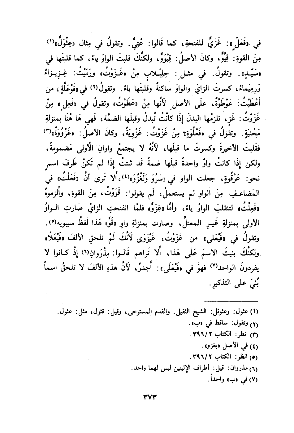 في "فَعَلٍّ": غَزَيٌّ للفتحةِ كما قَالوا: عُتِيٌّ. وتقولُ في مِثال "عِثْوَلٍّ"1 مِنَ القوةِ: قِيَّوٌّ وكانَ الأصلُ: قِيْوَوٌّ ولكنَّكَ قلبتَ الواوَ ياءً كما قلبتَها في "سَيّدٍ". وتقول. في مثلِ: حِلِبْلابٍ مِنْ "غَزَوْتُ" ورَمَيْتُ: غِزِيزاءُ وَرِميَماءُ كسرتَ الزايَ والواوَ ساكنةٌ وقلبتَها ياءً. وتقولُ2 في "فَوْعَلَّةٍ" من أَعْطَيْتُ: عَوْطَوَّةٌ علَى الأصلِ لأَنَّها مِنْ "عَطَوْتُ" وتقولُ في "فَعِلٍ" مِنْ غَزَوْتُ: غَزٍ تلزمُها البدلَ إِذَا كانْتُ تُبدلُ وقبلَها الضمَّة فَهي هَهُنَا بمنزلةِ مَحِنيَةٍ. وتقولُ في "فَعْلُوَةٍ" مِنْ غَزَوْتُ: غَزْوِيَةٌ وكانَ الأصلُ: "غَزْوُوَةٌ3" فقَلبتَ الأخيرةَ وكسرتَ ما قبلَها لأَنَّهُ لا يجتمعُ واوانِ الأُولى مَضمومةٌ ولكن إِذَا كانتْ واوٌ واحدةٌ قبلَها ضمةٌ قَد ثبتتْ إِذَا لم تَكنْ طَرفَ اسمٍ نحو: عَرْقُوةٍ جعلت الواو في "سَرُوَ وَلَغْزُوُ4، لا تَرى أَنَّ "فَعَلْتُ" في المضاعفِ مِنَ الواوِ لم يستعملْ لَم يقولوا: قَوَوْتُ مِنَ القوةِ وأَلزموهُ "فَعِلْتُ" لتنقلبَ الواوُ ياءً وأَمَّا "غِزَوٌّ" فلمَّا انفتحتِ الزايُ صارتِ الواوُ الأولى بمنزلةِ غَيرِ المعتلِّ وصارت بمنزلةِ وا و"قَوٍّ" هَذا لَفظُ سيبويه5. وتقولُ في "فَيْعَلى" من غَزَوْتُ غَيْزَوَى لأَنَّكَ لَمْ تلحقِ الألفَ "فَيْعَلاً" ولكنَّكَ بنيتَ الاسمَ عَلَى هَذا أَلا تَراهم قَالوا: مِذْروانِ6 إِذْ كانوا لا يفردونَ الواحد7 فهوَ في "فَيْعَلَى": أَجدرُ لأَنَّ هذهِ الألفَ لا تلحقُ اسمًا بُنيَ على التذكيرِ.