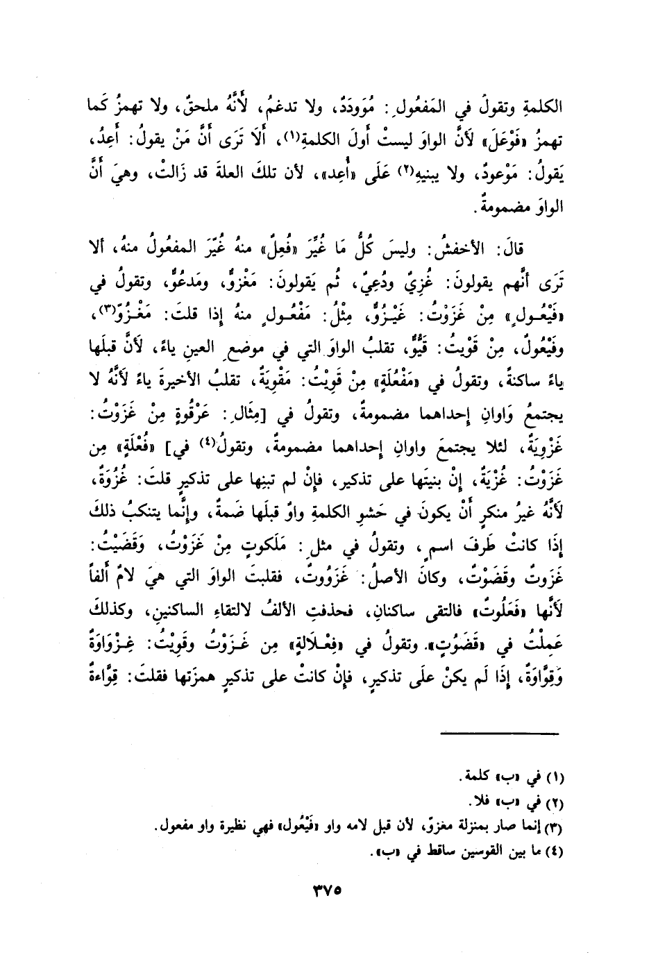 قالَ: الأخفشُ: وليسَ كُلُّ مَا غُيِّرَ "فُعِلٌ" منهُ غُيّرَ المفعُولُ منهُ ألا تَرَى أنَّهم يقولونَ: غُزِيٌ ودُعِيٌ ثُم يَقولونَ: مَغْزوٌّ ومَدعُوٌّ وتقولُ في "فَيْعُولٍ" مِنْ غَزَوْتُ: غَيْزُوٌّ مِثْلُ: مَفْعُولٍ منهُ إِذا قلتَ: مَغْزُوّ3 وفَيْعُولٌ مِنْ قَوْيتُ: قَيُّوٌّ تقلبُ الواوَ التي في موضعِ العينِ ياءً لأَنَّ قبلَها ياءً ساكنةً وتقولُ في "مَفْعُلَةٍ" مِنْ قَوِيْتُ: مَقْوِيَةٌ تقلبُ الأخيرةَ ياءً لأَنَّهُ لا يجتمعُ وَاوانِ إِحداهما مضمومةٌ وتقولُ في [مِثَالِ: عَرْقُوةٍ مِنْ غَزَوْتُ: غَزْوِيَةٌ لئلا يجتمعَ واوانِ إِحداهما مضمومةٌ وتقولُ4 في] "فُعْلَةٍ" مِن غَزَوْتُ: غُزْيَةٌ إِنْ بنيتَها على تذكير فإِنْ لم تبنِها على تذكيرٍ قلتَ: غُزُوَةٌ لأَنَّهُ غيرُ منكرٍ أَنْ يكونَ في حَشوِ الكلمةِ واوٌ قبلَها ضَمةٌ وإِنَّما يتنكبُ ذلكَ إِذَا كانتْ طَرفَ اسمٍ وتقولُ في مثلِ: مَلَكوتٍ مِنْ غَزَوْتُ وَقَضَيْتُ: غَزَوتٌ وقَضَوْتٌ وكانَ الأصلُ: غَزَوُوتٌ فقلبتَ الواوَ التي هيَ لامٌ ألفًا لأَنَّها "فَعَلُوتٌ" فالتقى ساكنانِ فحذفتِ الألفُ لإلتقاءِ الساكنينِ وكذلكَ عَمِلْتُ في "قَضَوُتٍ" وتقولُ في "فَعْلاَلةٍ" مِن غَزَوْتُ وقَوِيْتُ: غِزْوَاوَةٌ وَقِوَّاوَةٌ إِذَا لَم يكنْ علَى تذكيرٍ فإِنْ كانتْ على تذكيرٍ همزَتها فقلتَ: قَوَّاءةٌ