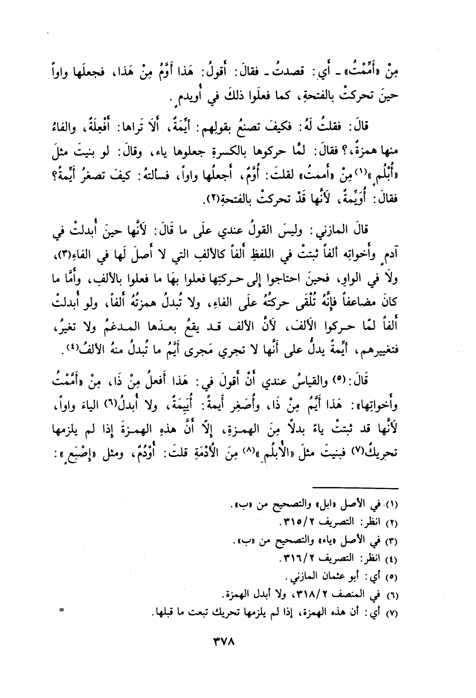 قالَ المازني: وليسَ القولُ عندي علَى ما قَالَ: لأَنَّها حينَ أُبدلتْ في آدمٍ وأَخواتِه ألفًا ثبتتْ في اللفظِ ألفًا كالألفِ التي لا أصلَ لَها في الفاءِ3، ولاَ في الواوِ فحينَ احتاجوا إلى حركتِها فعلوا بهَا ما فعلوا بالألفِ وأَمَّا ما كانً مضاعفًا فإِنَّهُ تُلْقَى حركتُهُ علَى الفاءِ ولا تُبدلُ همزتُهُ ألفًا ولو أُبدلتْ ألفًا لمّا حركوا الأَلفِ لأَنَّ الألف قد يقعُ بعدَها المدغمُ ولا تغيرُ فتغييرهم أيِّمةً يدلُ على أَنَّها لا تجري مَجرى أَيَّمُ ما تُبدلُ منهُ الألفُ4.