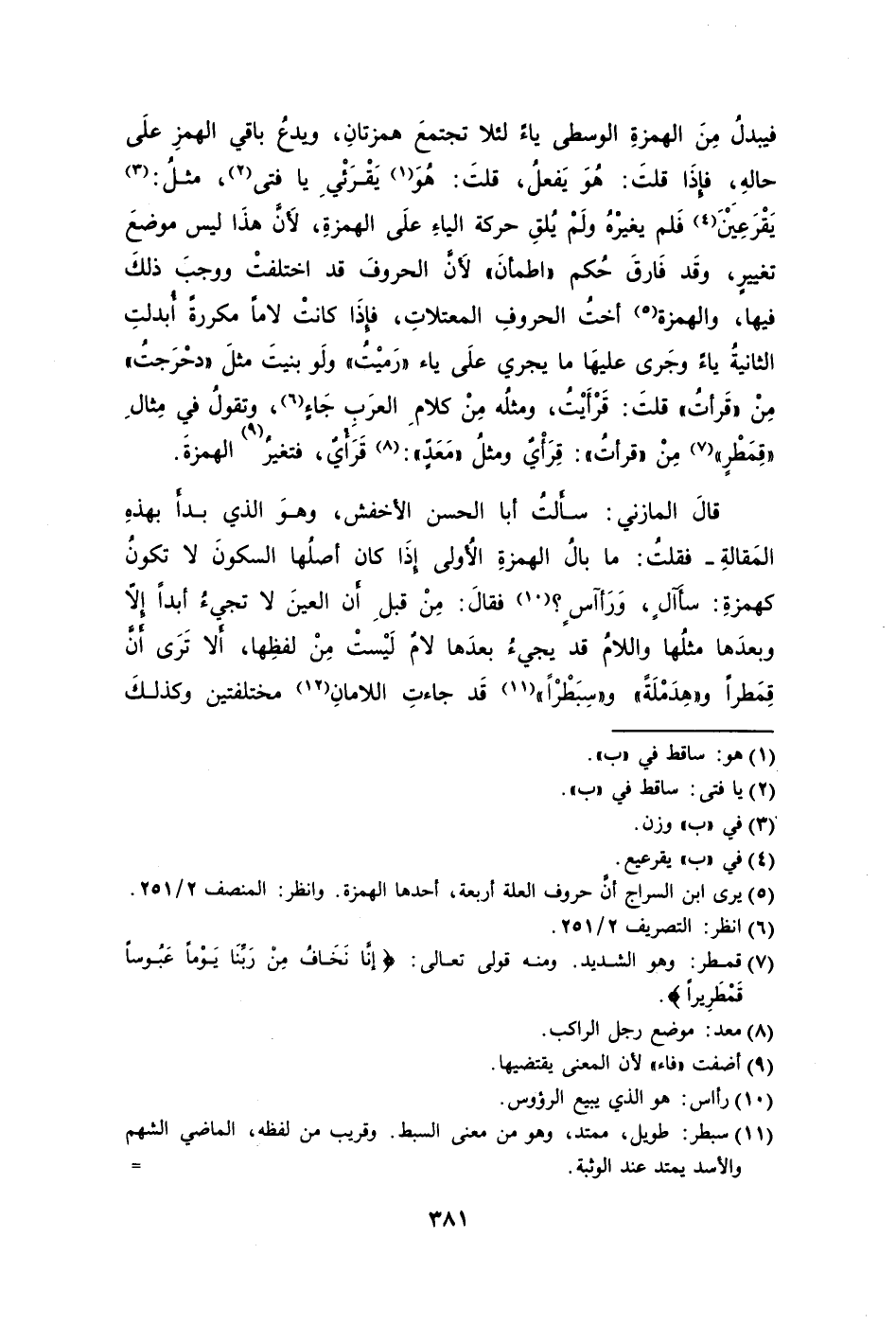 قالَ المازني: سأَلتُ أبا الحسن الأخفش وهوَ الذي بدأَ بهذهِ المَقالةِ فقلتُ: ما بالُ الهمزةِ الأُولى إِذَا كان أصلُها السكونَ لا تكونُ كهمزةِ: سأآلٍ وَرَأآسٍ؟ 10 فقالَ: مِنْ قبلِ أَن العينَ لا تجيءُ أبدًا إلا وبعدَها مثلُها واللامُ قد يجيءُ بعدَها لامٌ لَيْستْ مِنْ لفظِها أَلا تَرَى أَنَّ قِمَطرًا و"هِدَمْلَةً" و"سِبْطْرْاً"11 قَد جاءتِ اللامانِ مختلفتين وكذلكَ