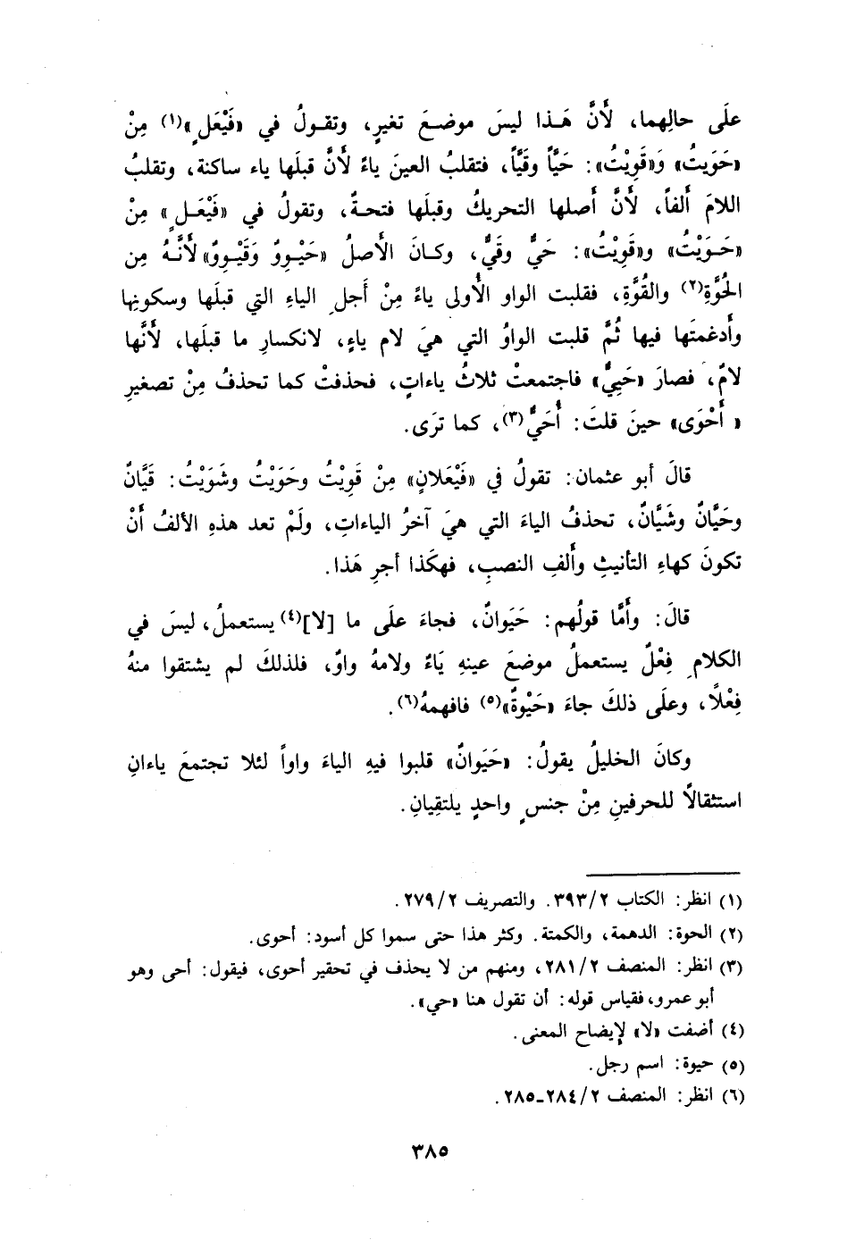 قالَ أبو عثمان: تقولُ في "فَيْعَلانٍ" مِنْ قَوِيْتُ وحَوَيْتُ وشَوَيْتُ: قَيَّانٌ وحَيَّانٌ وشَيَّانٌ تحذفُ الياءَ التي هيَ آخرُ الياءاتِ ولَمْ تعدْ هذهِ الألفُ أَنْ تكونَ كهاءِ التأنيثِ وأَلفِ النصبِ فهكَذا أجرِ هَذا.