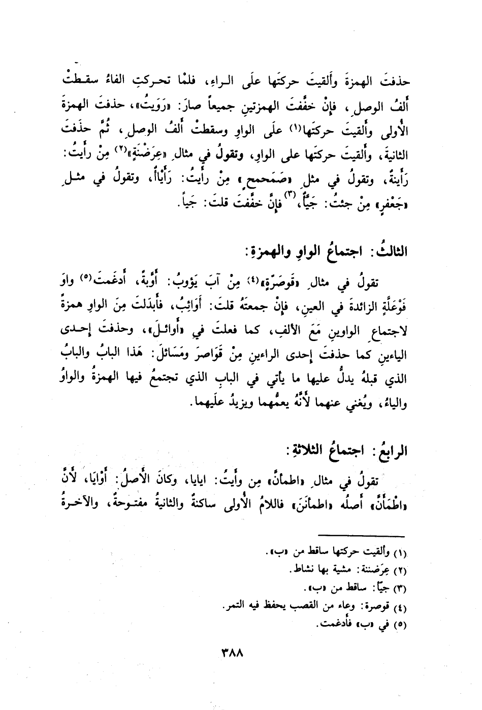 حذفتَ الهمزةَ وأَلقيتَ حركتَها علَى الراءِ فلمْا تحركتِ الفاءُ سقطتْ أَلفُ الوصلِ فإِنْ خفَّفتَ الهمزتينِ جميعًا صارَ: "رَوَيتُ" حذفتَ الهمزةَ الأُولى وأَلقيتَ حركتَها1 علَى الواوِ وسقطتْ أَلفُ الوصلِ ثُمَّ حذَفتَ الثانيةَ وأَلقيتَ حركتَها على الواوِ وتقولُ في مثالِ "عِرَضْنَةٍ"2 مِنْ رأَيتُ: رَأَينةٌ وتقولُ في مثلِ "صَمَحمحٍ" مِنْ رأَيتُ: رَأَيْاأٌ وتقولُ في مثلِ "جَعْفرٍ" مِنْ جئتُ: جَيَّأٌ3 فإِنَّ خفَّفتَ قلتَ: جَيًا.