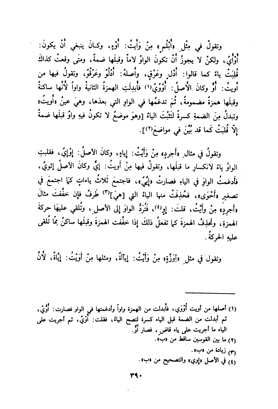 وتقولُ في مثالِ "أَجردٍ" مِنْ وَأَيْتُ: إِياءٍ وكانَ الأصلُ: إِوْإيٌ فقلبتِ الواوُ ياءً لانكسار ما قبلَها وتقولُ فيها مِنْ أَويتُ: إيٌّ وكانَ الأصلُ إئويٌ فأَدغمتُ الواوَ في الياءِ فصارتْ "إِيَّيٌ" فاجتمعَ ثَلاثُ ياءاتٍ كمَا اجتمعَ في تصغيرِ "أَحْوَى" فحُذِفَتْ منها الياءُ التي [هيَ] 3 طَرفٌ فإِن خفَّفتَ مثالَ "أَجردٍ" مِنْ وأَيْتُ قلتَ: إِوٍ4، فُتُرَدُّ الواوَ إِلى الأصلِ وتُلقي عليهَا حركةَ الهمزةِ وتَحذِفُ الهمزةَ كما تفعلُ ذلكَ إِذا خفَّفت الهمزةَ وقبلَها ساكنٌ مِمَّا تُلقى عليهِ الحركةُ.