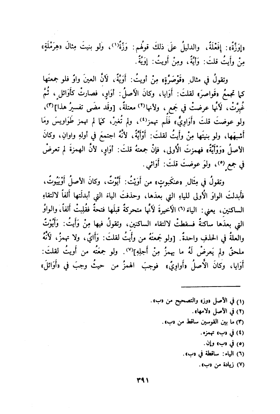 وتقولُ في مِثَالِ "عنكَبوتٍ" من أَوَيْتُ: أَيَّوْتٌ وكانَ الأصلُ أَوْيَيُوتٌ فأَبدلتَ الواوَ الأُولى للياءِ التي بعدَها وحذفتَ الياءَ التي أبدلتَها ألفًا لإلتقاءِ الساكنينِ يعني: الياءَ6 الأَخيرةَ لأَنَّها متحركةٌ قبلَها فتحةٌ فقُلِبتْ ألفًا والواوُ التي بعدَها ساكنةٌ فسقطتْ لإلتقاء الساكنينِ وتقولُ فيها مِنْ وَأَيتُ: وَأَيُوْتٌ والعلةُ في الحذفِ واحدةٌ. [ولو جَمعتَهُ من وأَيتُ لقلتَ: وَأَايٌ ولا تهمزُ لأَنَّهُ ملحقٌ ولم يَعرضْ لَهُ ما يهمزُ مِنْ أَجلِهِ] 7. ولو جمعَتُه من أَويتُ لقلتَ: أَوَايا وكانَ الأَصلُ "أَواوِيٌ" فوجبَ الهمزُ من حيثُ وجبَ في "أَوَائلَ"