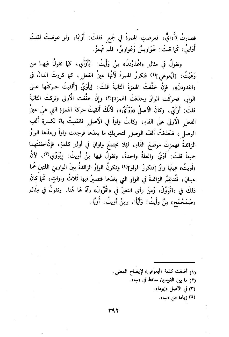 وتقولُ في مثالِ "اغْدَوْدَنَ" مِنْ وَأَيتُ: أيْأَوْأَي كمَا تقولُ فيها من وَعَيْتُ: [ايُعوعي] 1 فتكررُ الهمزةَ لأَنَّها عينُ الفعلِ كما كررتَ الدالَ في "اغدودنَ" فإِنْ خفَّفتَ الهمزةَ الثانيةَ قلتَ: إيأَوَيٌ [أَلقيتَ حركتَها على الواوِ فحركتَ الواوَ وحذفتَ الهمزة] 2 وإِنْ خفَّفت الأُولى وتركتَ الثانيةَ قلتَ: أَوأَيٌ وكانَ الأَصلُ "وَوْأَيٌ" لأَنَّكَ أَلقيتَ حركةَ الهمزةِ التي هيَ عينُ الفعلِ الأُولى علَى الفاءِ وكانتْ واوًا في الأَصلِ فانقلبتْ ياءً لكسرةِ أَلفِ الوصلِ فحَذفتَ أَلفَ الوصلِ لتحريكِ ما بعدَها فرجعت واوًا وبعدَها الواوُ الزائدةٌ فهمزتَ موضعَ الفَاءِ لئِلا تجتمعَ واوانِ في أَولِ كلمةٍ فإِنْ خففتَهما جميعًا قلتَ: أَوَيٌ والعلةُ واحدةٌ وتقولُ فيها مِنْ أَويتُ: إِيْوَوّي3، لأَنَّ "أَويتُ" عينَها واوٌ [فتكررُ الواوَ] 4، وتكونُ الواوُ الزائدةُ بينَ الواوينِ اللتينِ هُما عينانِ فتُدغِمُ الزائدةَ في الواوِ التي بعدَها فتصيرُ فيها ثَلاثُ واواتٍ كَما كانَ ذَلكَ في "اقْوَوَّلَ" وَمنْ رأَى التغيرَ في "اقْوَّولِ" رآهُ هَهُنَا. وتقولُ في مِثَالِ "صَمَحْمَح" مِنْ وأَيتُ: وَأَيْأَ ومِنْ أَويتُ: أُويَّا.