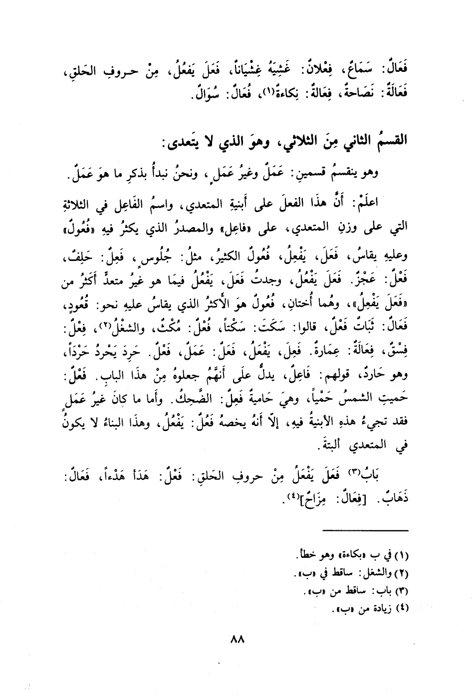 اعلَمْ: أَنَّ هذَا الفعلَ على أَبنيةِ المتعدي واسمُ الفَاعِل في الثلاثةِ التي على وزنِ المتعدي على "فاعِل" والمصدرُ الذي يكثرُ فيهِ "فُعُولٌ" وعليهِ يقاسُ فَعَلَ يَفْعِلُ فُعُولٌ الكثيرُ مثلُ: جُلُوسٍ فَعِلٌ: حَلِفٌ فَعْلٌ: عَجْزٌ. فَعَلَ يَفْعَلُ وجدتُ فَعَلَ يَفْعَلُ فيمَا هو غيرُ متعدٍّ أَكَثرُ من "فَعَلَ يَفْعِلُ" وهُما أُختانِ فَعُولٌ هوَ الأَكثرُ الذي يقاسُ عليهِ نحو: قُعُودٍ فَعَالٌ: ثَبَاتٌ فَعْلٌ قالوا: سَكَتَ: سَكْتًا فُعْلٌ: مُكْثٌ والشغْلُ2 فِعْلٌ: فِسْقٌ فِعَالَةٌ: عِمَارةٌ. فَعِلَ يَفْعَلُ فَعَلٌ: عَمَلٌ فَعْلٌ حَرِدَ يَحْردُ حَرْدًا وهو حَاردٌ قولهم: فَاعِلٌ يدلٌّ علَى أَنهَّمُ جعلوهُ مِنْ هذَا البابِ فَعْلٌ: حَميتِ الشمسُ حَمْيًا وهيَ حَاميةٌ فَعِلٌ: الضَّحِكُ وأَما ما كانَ غيرُ عَمَلٍ فقد تجيءُ هذهِ الأبنيةُ فيهِ إلا أَنهُ يخصهُ فَعُلٌ: يَفْعُلُ وهذَا البناءُ لا يكونُ في المتعدي ألبتةَ.