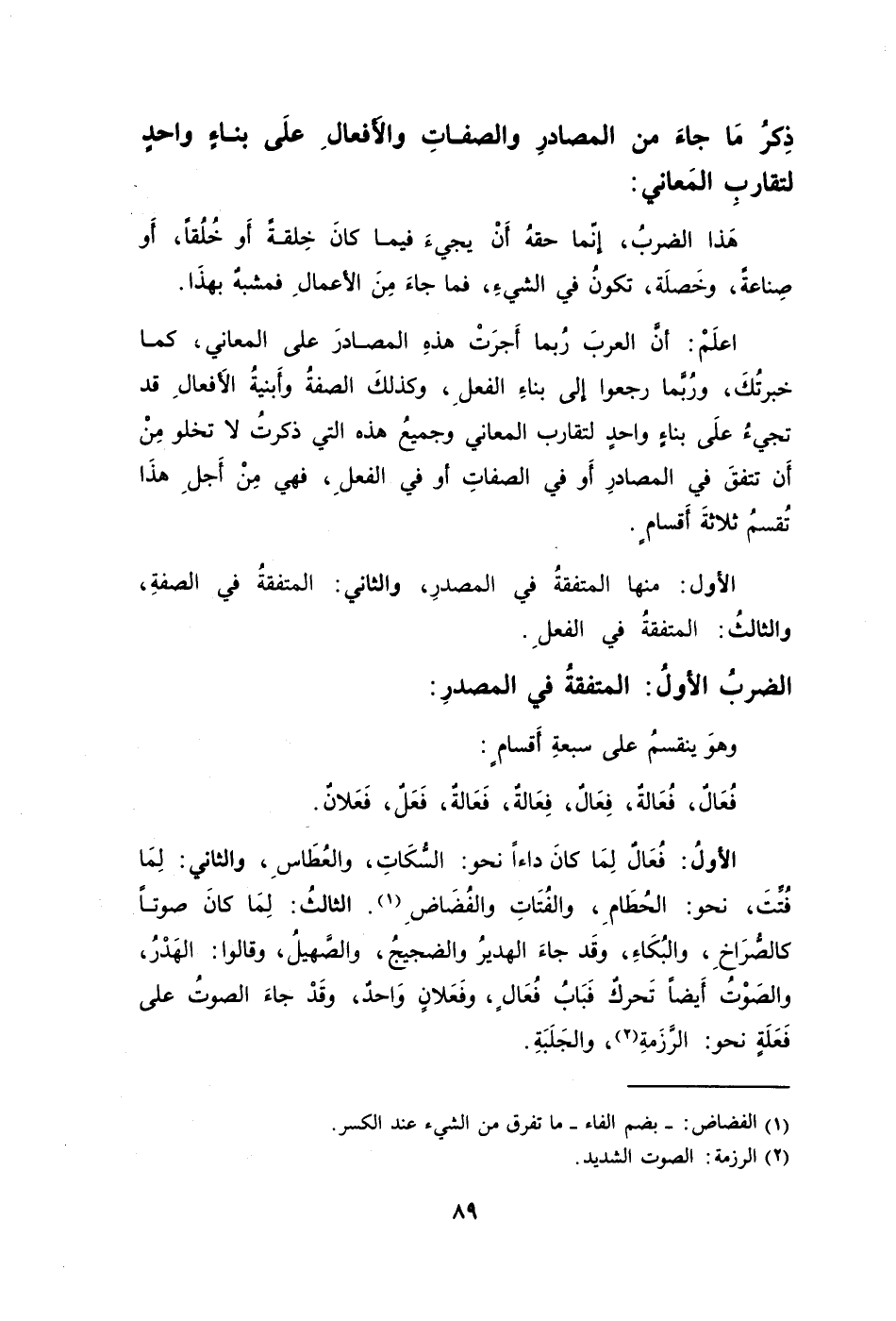 اعلَمِْ: أنَّ العربَ ربُما أَجرِتْ هذهِ المصادرَ على المعاني كما خبرتُكَ ورُبَّما رجعوا إلى بناءِ الفعلِ وكذلكَ الصفةُ وأَبنيةُ الأََفعالِ قد تجيءُ علَى بناءٍ واحدٍ لتقارب المعاني وجميعُ هذه التي ذكرتُ لا تخلو منْ أَن تتفقَ في المصادرِ أو في الصفاتِ أو في الفعلِ فهي مِنْ أَجلِ هذَا تُقسمُ ثلاثةَ أَقسامِ.