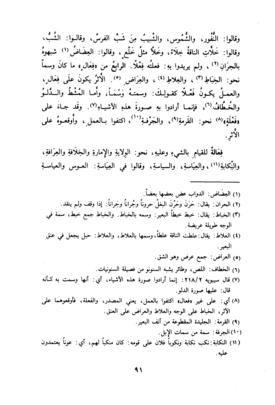 وقالوا: النُّفُور والشُّمَوس والشَّبيبُ مِنَ شَبَّ الفرسُ وقالوا: الشَّبُّ وقالوا: خَلأَتِ الناقةُ خِلاَءً وخَلًا مثلُ خَلْعٍ وقالوا: العِضَاضُ1 شبهوهُ بالحِرَانِ2 ولم يريدوا بهِ: فعلتُه فِعْلًا. الرابعُ من "فِعَالٍ" ما كانَ وسمًا نحو: الخِبَاطِ3 والعِلاطِ4 والعِرَاضِ5. الأَثرُ يكونَ علَى فِعَالٍ والعملُ يكونُ فَعْلًا كقولِكَ: وسمتهُ وَسْمًَا وأَما المُشْطُ والدَّلوُ والخُطَّافُ6، فإنما أرادوا بهِ صورةَ هذهِ الأشياءِ7. وقَد جاءَ على "فَعْلَةٍ" 8 نحو: القَرمةِ9، والجَرْفةِ10، اكتفوا بالعملِ وأَوقعوهُ على الأَثرِ.