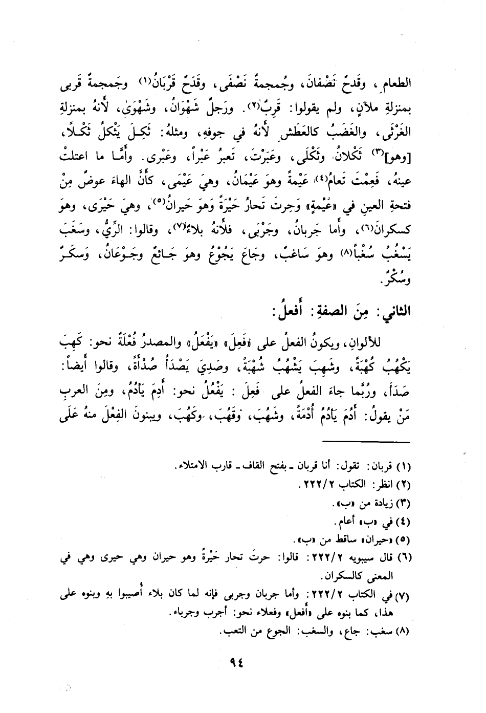 وأمَّا ما اعتلتْ عينهُ فَعِمْتَ تَعامُ4 عَيْمَةً وهوَ عَيْمَانُ وهيَ عَيْمَى كأَنَّ الهاءَ عوضٌ مِنْ فتحةِ العينِ في "عَيْمةٍ" وَحِرتَ تَحارُ حَيْرَةً وَهوَ حَيرانُ5، وهيَ حَيْرَى وهوَ كسكرانَ6، وأَما جَربانُ وجَرْبَى فلأَنهُ بلاءٌ7 وقالوا: الرِّيُّ وسَغَبَ يَسْغُبُ سُغْباً8 وهوَ سَاغبٌ وجَاعَ يَجُوْعُ وهوَ جَائعٌ وجَوعَانُ وَسكَرٌ وسُكْرٌ.