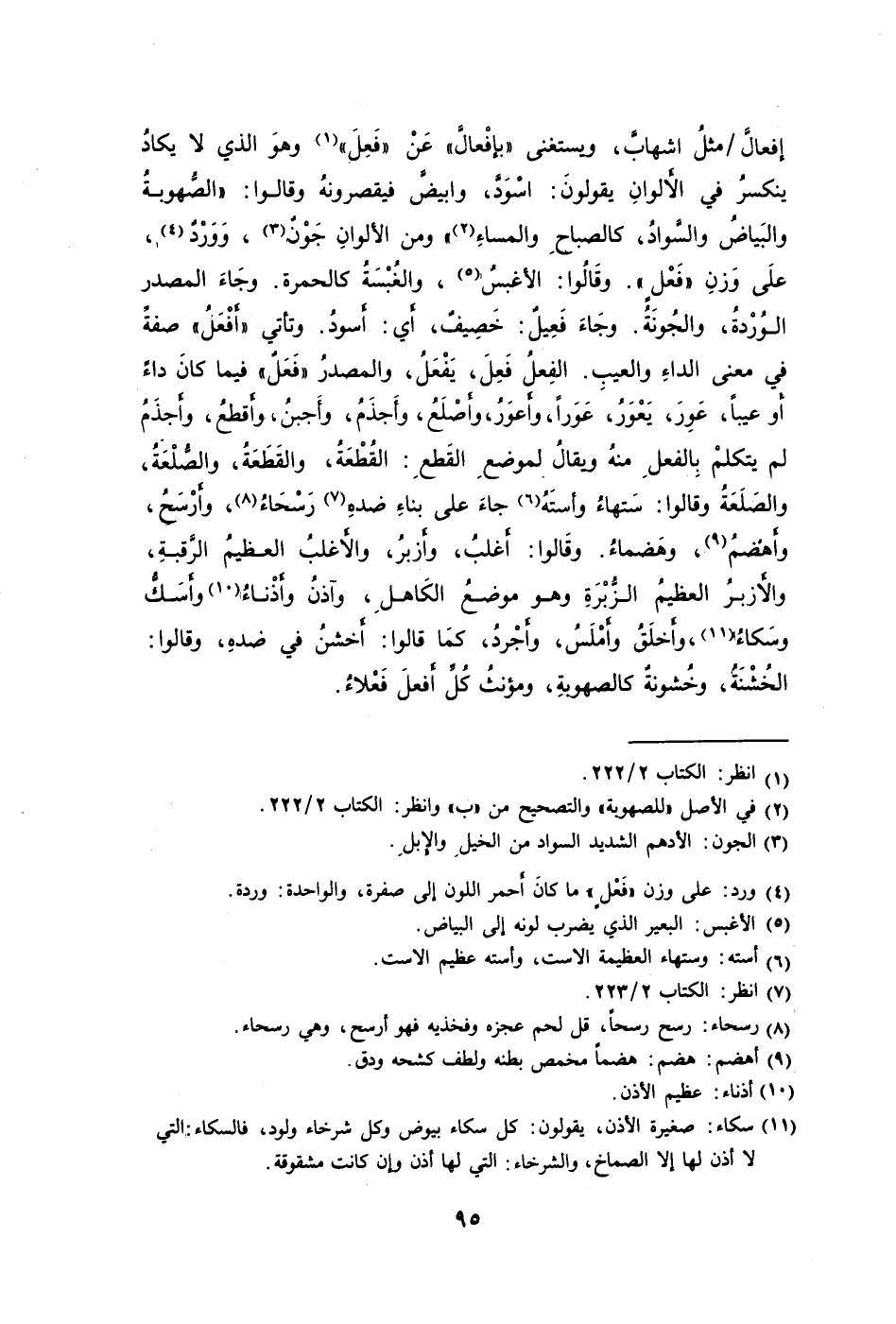 وجَاءَ المصدر الوُرْدَةُ والجُونَةُ. وجَاءَ فَعِيلٌ: خَصِيفٌ أَي: أسودُ. وتأتي "أَفْعَلُ" صفةً في معنى الداءِ والعيبِ. الفِعلُ فَعِلَ يَفْعَلُ والمصدرُ "فَعَلٌ" فيما كانَ داءٍّ أو عيبًا عَوِرَ يَعْوَرُ عَوَرًا وأَعوَرُ وأَصْلَعُ وأَجذَمُ وأَجبنُ وأَقطعُ وأَجذَمُ لم يتكلمْ بِالفعلِ منهُ ويقالُ لموضعِ القَطعِ: القُطْعَةُ والقَطَعَةُ والصُّلْعَةُ والصَلَعَةُ وقالوا: سَتهاءُ وأستَهُ6 جاءَ على بناءِ ضدهِ7 رَسْحَاءُ8 وأَرْسَحُ وأَهضمُ9 وهَضماءُ. وقَالوا: أَغلبُ وأَزبرُ والأَغلبُ العظيمُ الرَّقبةِ والأَزبرُ العظيمُ الزُّبْرَةِ وهو موضعُ الكَاهلِ وآذنُ وأَذْناءُ10 وأَسَكٌّ وسَكاءُ11 وأَخلَقُ وأَمْلَسُ وأَجْردُ كمَا قالوا: أَخشنُ في ضدهِ وقالوا: الخُشْنَةُ وخُشونةٌ كالصهوبةِ ومؤنثُ كُلِّ أَفعلَ فَعْلاءُ.
