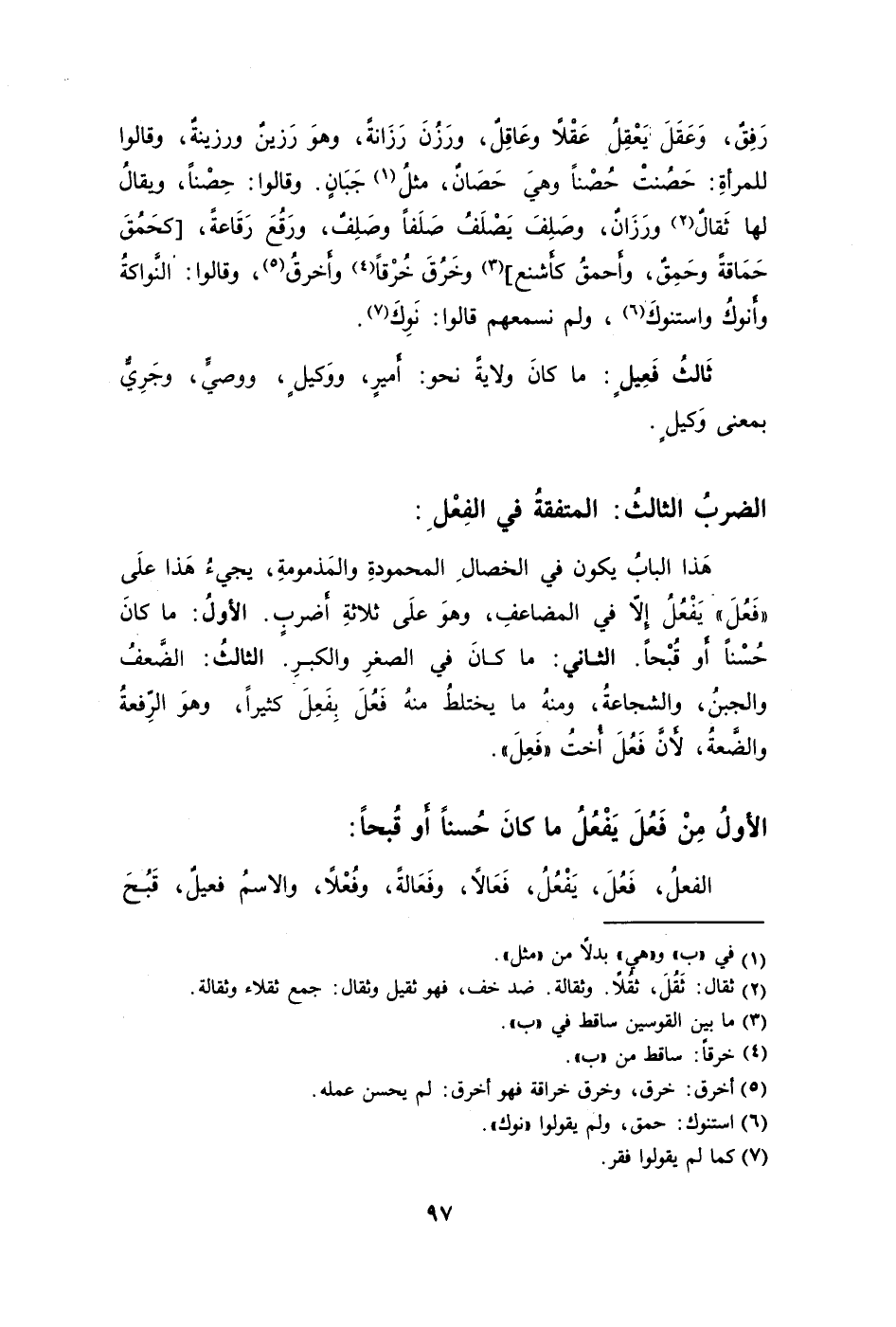 هَذا البابُ يكون في الخصالِ المحمودةِ والمَذمومةِ يجيءُ هَذا علَى "فَعُلَ" يَفْعُلُ إلا في المضاعفِ وهوَ علَى ثلاثةِ أَضربٍ. الأولُ: ما كانَ حُسْنًا أَو قُبْحًا. الثاني: ما كانَ في الصغرِ والكبرِ. الثالثُ: الضَّعفُ والجبنُ والشجاعةُ ومنهُ ما يختلطُ منهُ فَعُلَ بِفَعِلَ كثيرًا وهوَ الرِّفعةُ والضَّعةُ لأَنَّ فَعُلَ أُختُ "فَعِلَ".